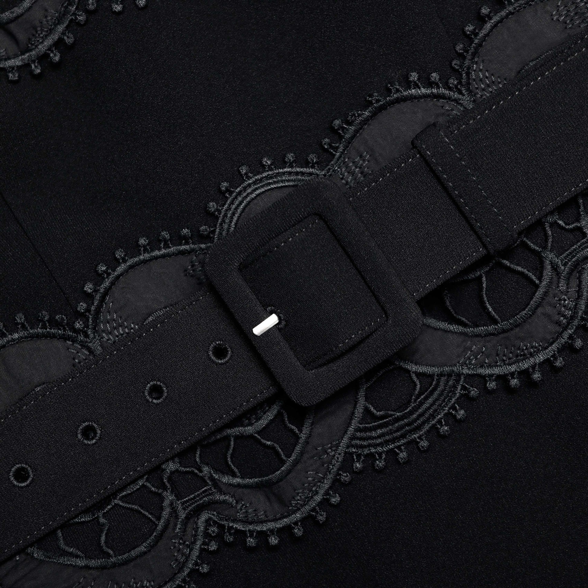 Bu siyah krepten kesilmiş, fit ve flare midi elbise ile muhteşem bir zaman sizi bekliyor. Fiyonk tığ işi panelleri, cildin çekici detaylarını öne çıkarır – şık bir gece çıkışı için topuklularla tamamlayın.