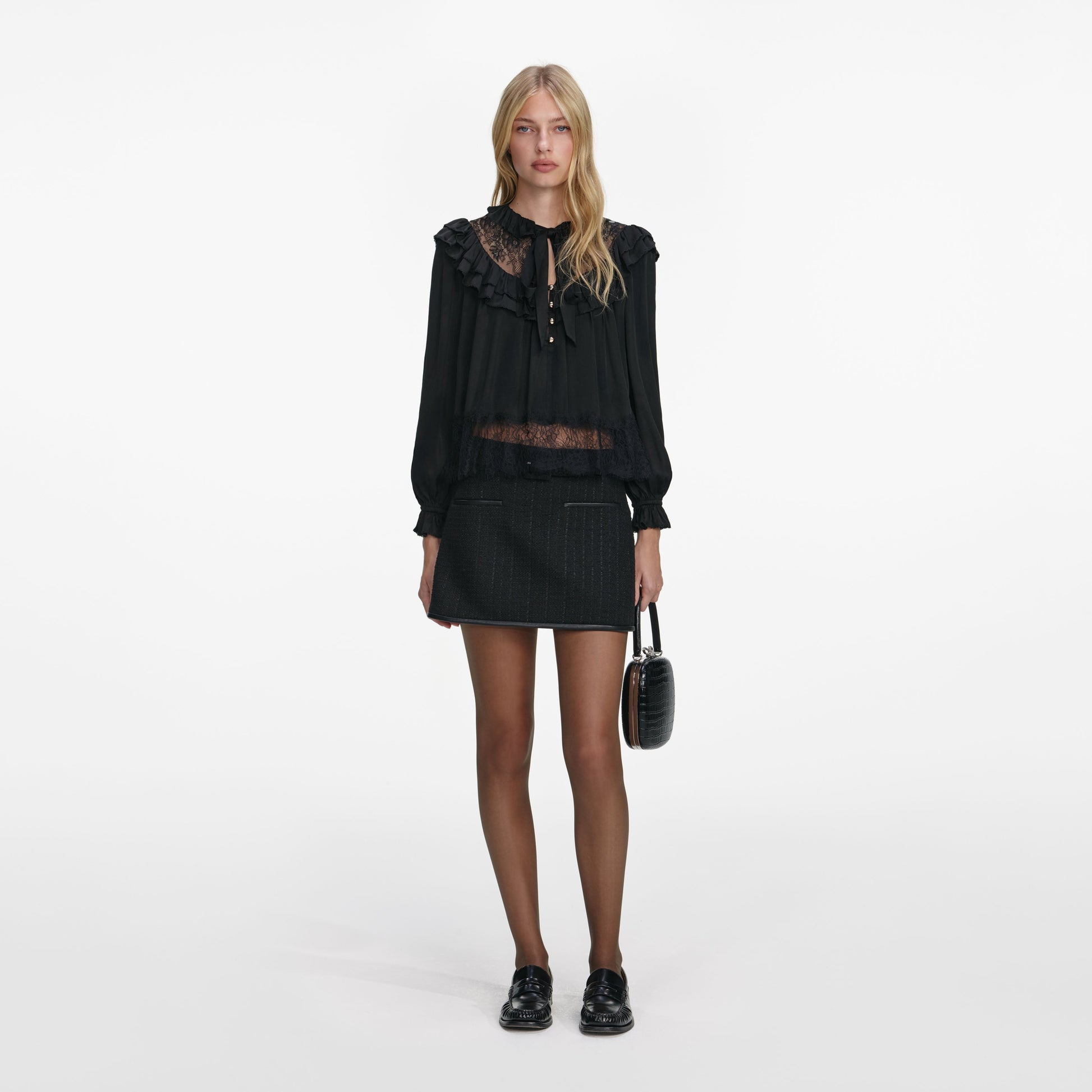 Her kombine zarafet katan bu siyah bluz, volan detayları ve şeffaf dantel panelleriyle neşeli bir dokunuş sunar. Bunu, oversize denimlerle ve deri mini eteklerle rahatlıkla kombinleyin.