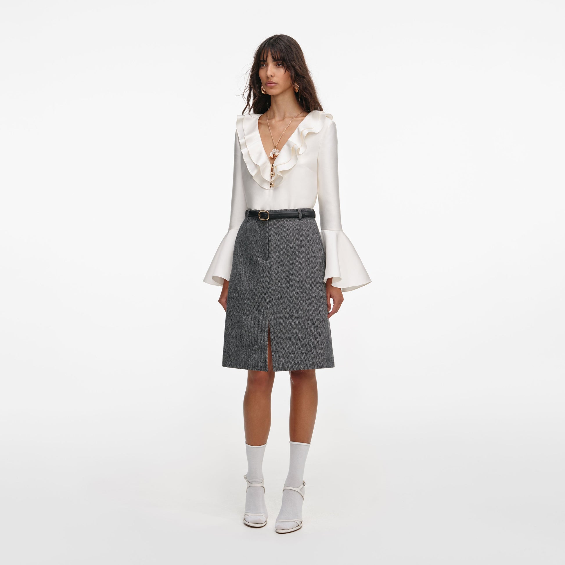Oynak bir ön yırtmaç, bu balıksırtı yün midi eteğe modern bir dokunuş katıyor. Şık durması için kemerli, hafta sonu brunch'ı için bir tişörtle kombinleyin veya kritik toplantılar için uyumlu ceketimizi ekleyin.