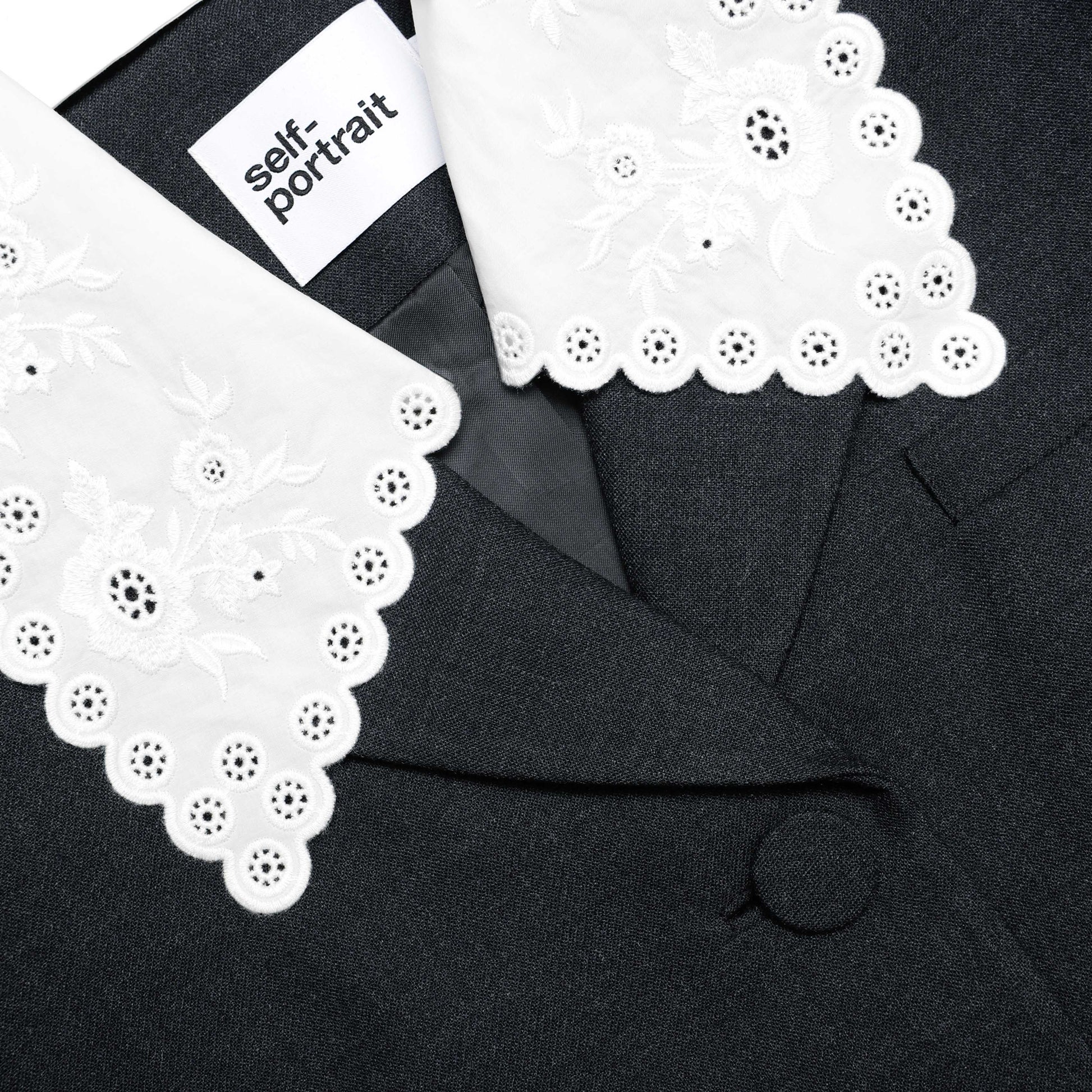 Kontrast broderie anglaise yakası, bu gri yün cekete zanaatkar bir detay katıyor. Kutu şeklindeki, kısa kesimi şık bir duruş sunar ve yüksek belli kot pantolonlar ile kalem etekler için idealdir.