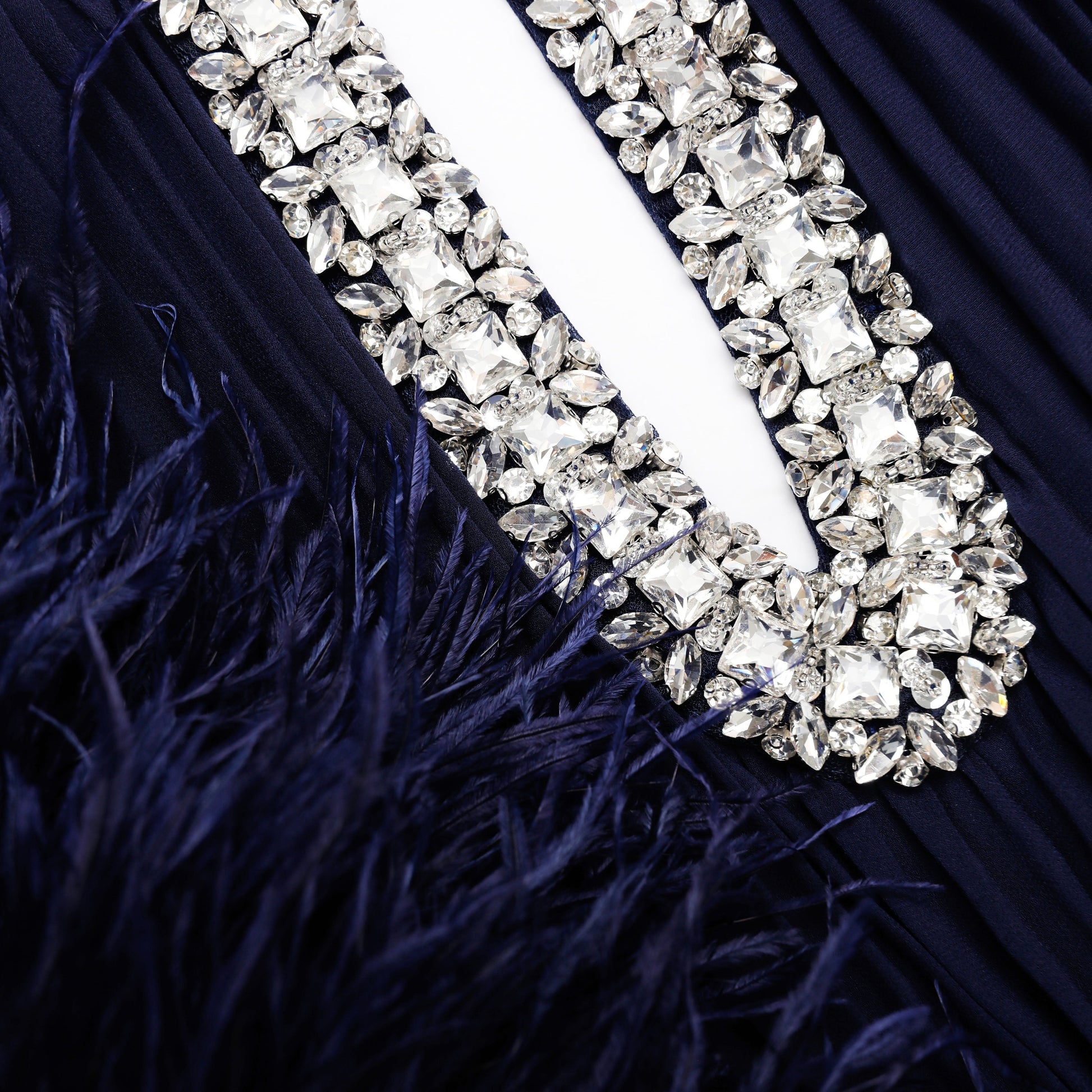 Bu pileli şifon midi elbise ile koyu romantizmi yansıtın; yakasında parıldayan diamanté süslemeler ve dramatik tüy manşetleriyle öne çıkar. Ekstra stil puanı için bizim dikkat çekici küpelerimizle kombinleyin.