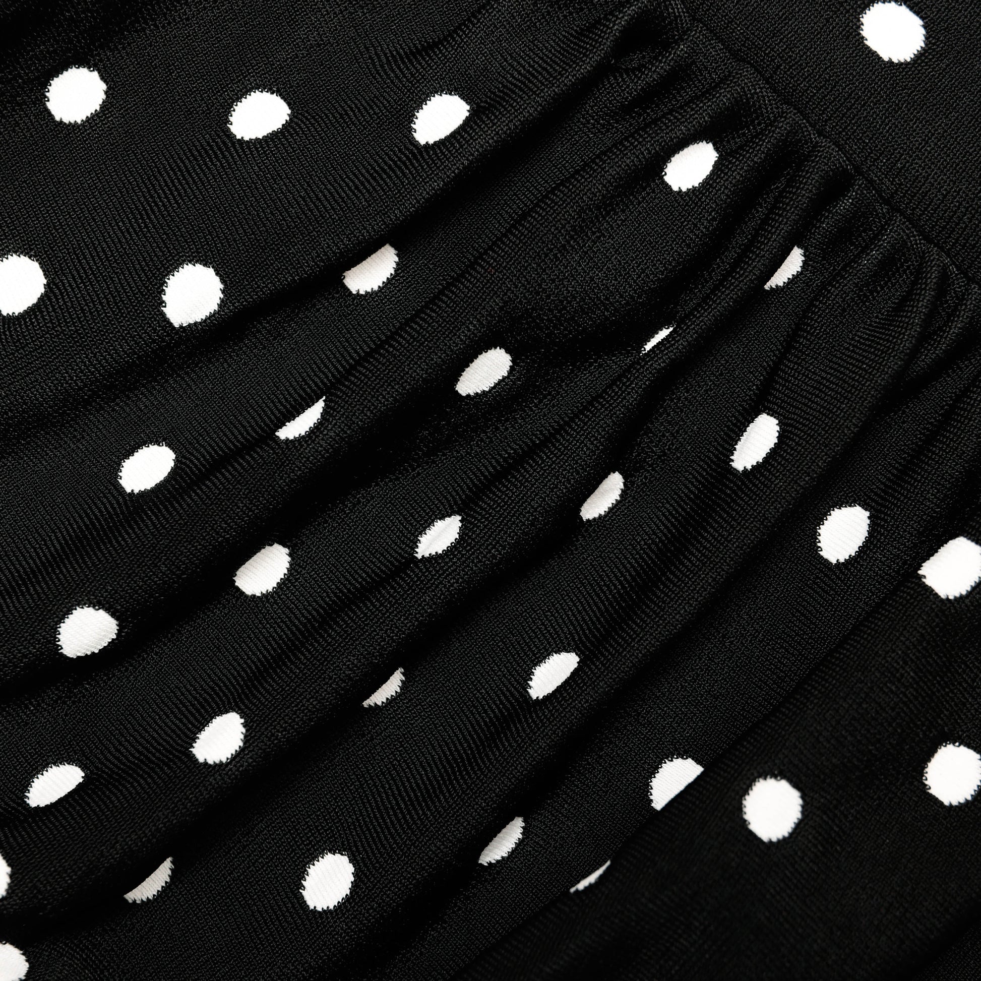 Şık konfor, bu dökümlü triko mini elbisede eğlenceli puantiyelerle buluşuyor. Asimetrik bir yaka, vücuda oturan drapaj detayının üzerinde merak uyandıran bir dokunuş katıyor – gece davetleri için topuklu ayakkabı ekleyin.