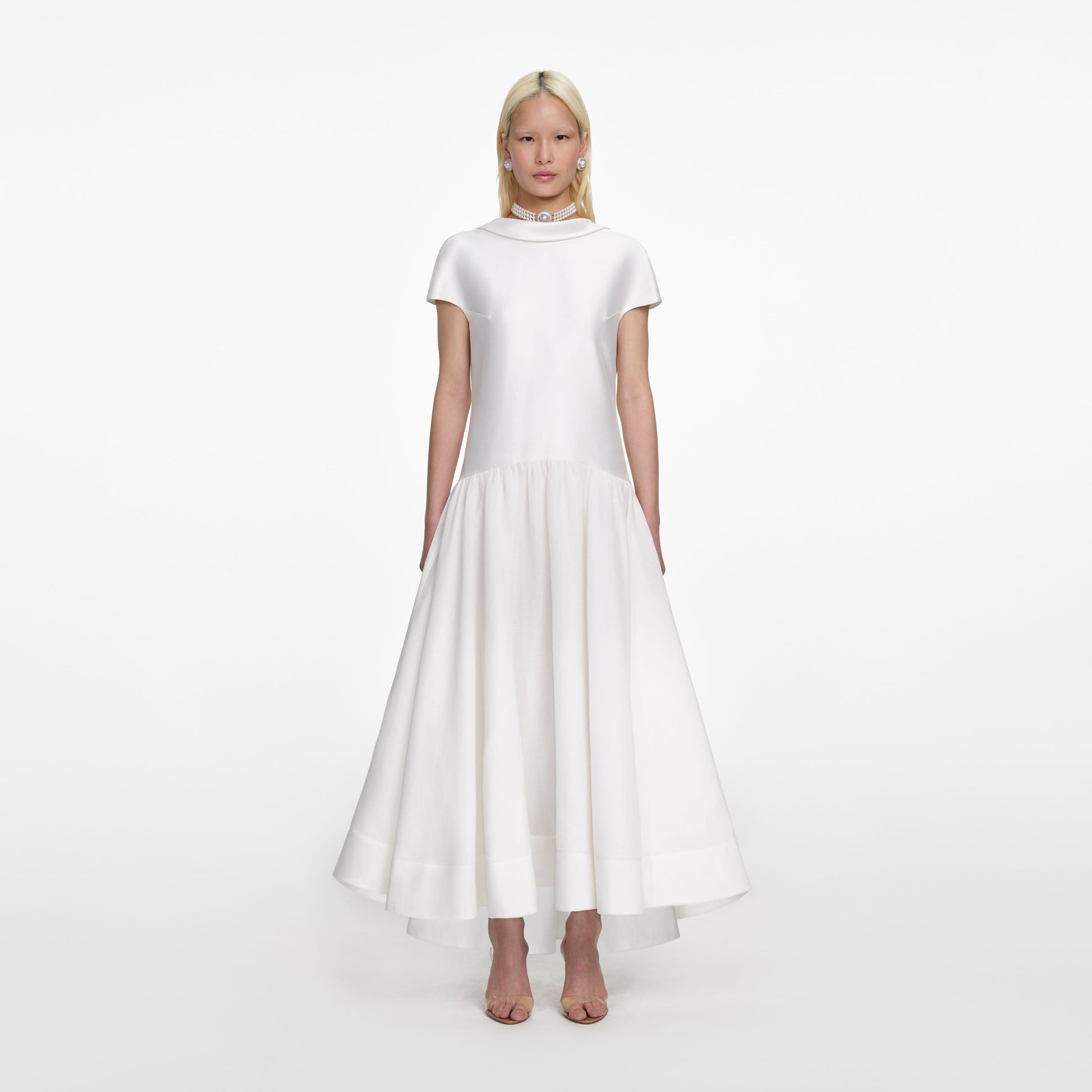 Beyaz Saten Ramie Midi Elbise
