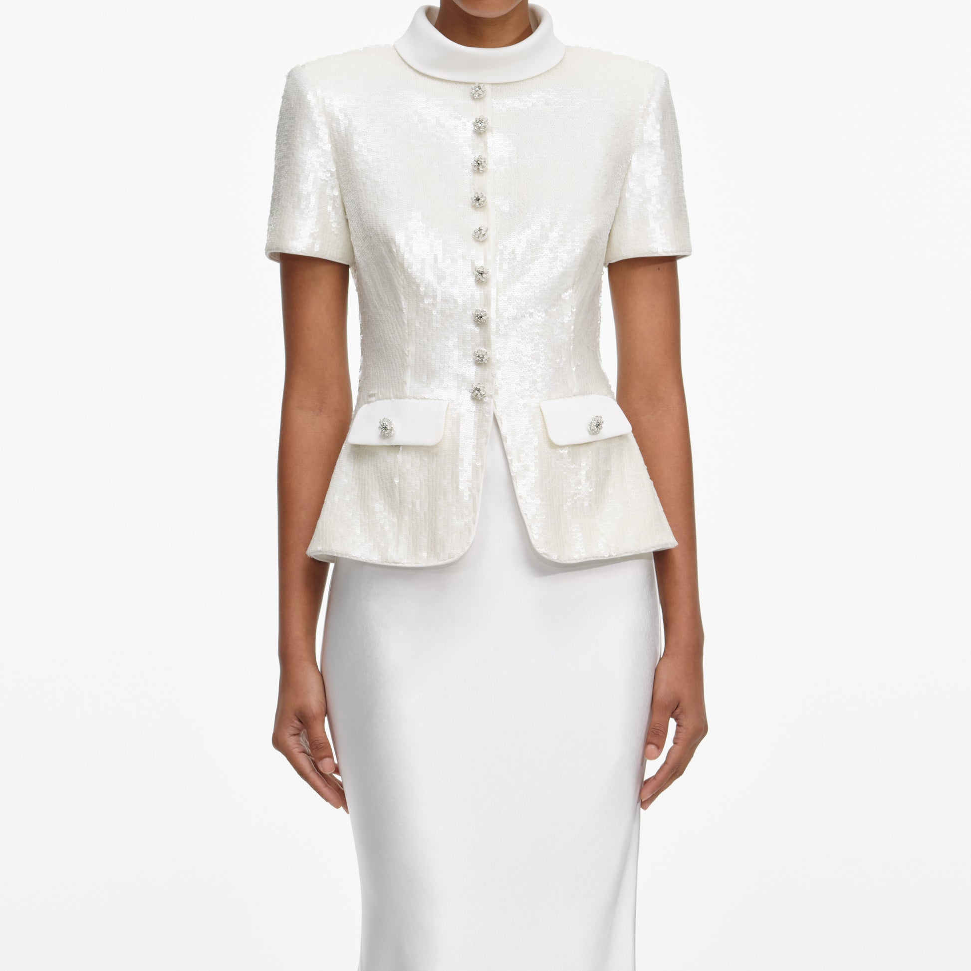 İnci parlaklığındaki payetler, bu beyaz kesim maksi elbiseye sofistike bir parlaklık katıyor. Yüksek yakayla çerçevelenen akışkan saten etek, denizkızı etek ucuna indiriyor. Mücevher işlemeli düğmeler ise en güzel detaylar.