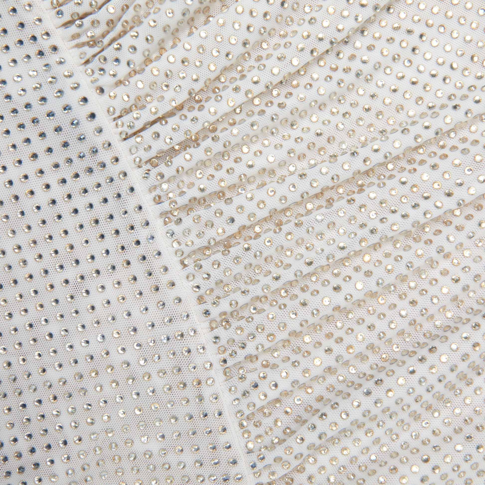 Şampanya renkli taşlarla süslenmiş file kumaştan üretilen bu parıltılı midi etek, yüksek parlaklık hissini şekillendirilmiş kesim ve cesur kesik detaylarla bir araya getiriyor. Dramatik etkiyi artırmak için küpe ve topuklu ayakkabılarımızı ekleyin.