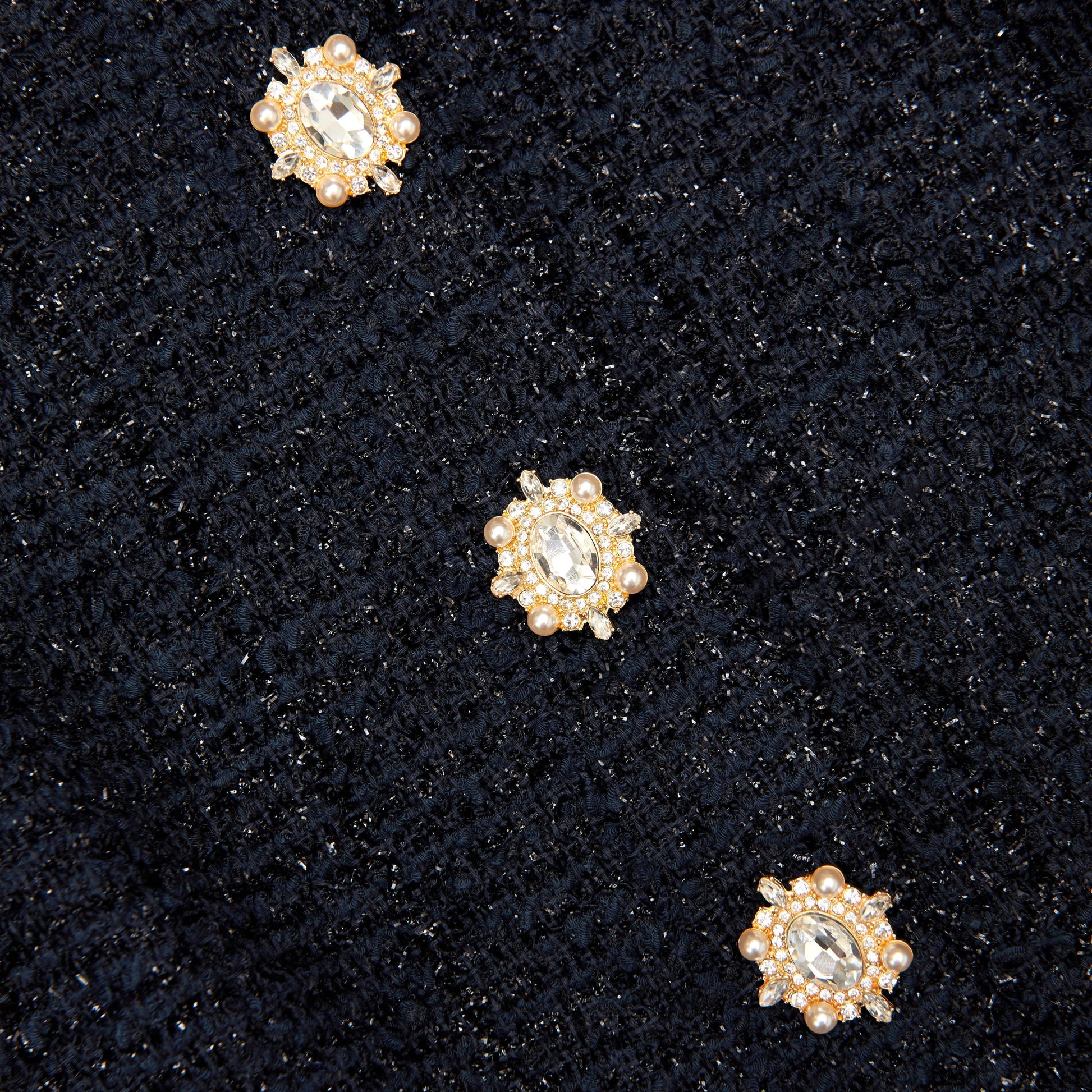 Sanatsal kontrastların bir dersi olan bu küçük lacivert elbise, terzi işi bukle'nin yumuşak yapısını oyunbaz bir balon etekle birleştiriyor — onu iddialı küpeler, göğe uzanan topuklular ve iyi bir partiyle kombinleyin.