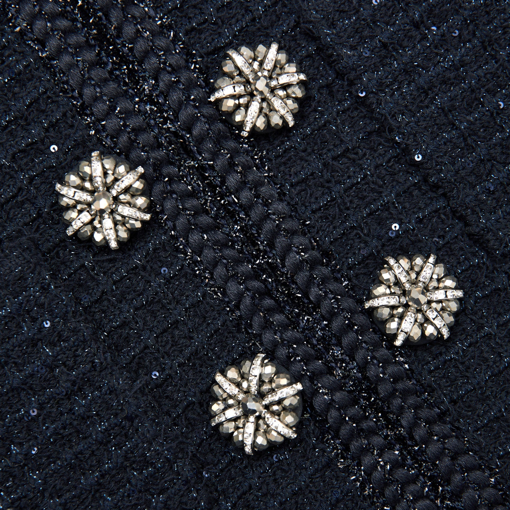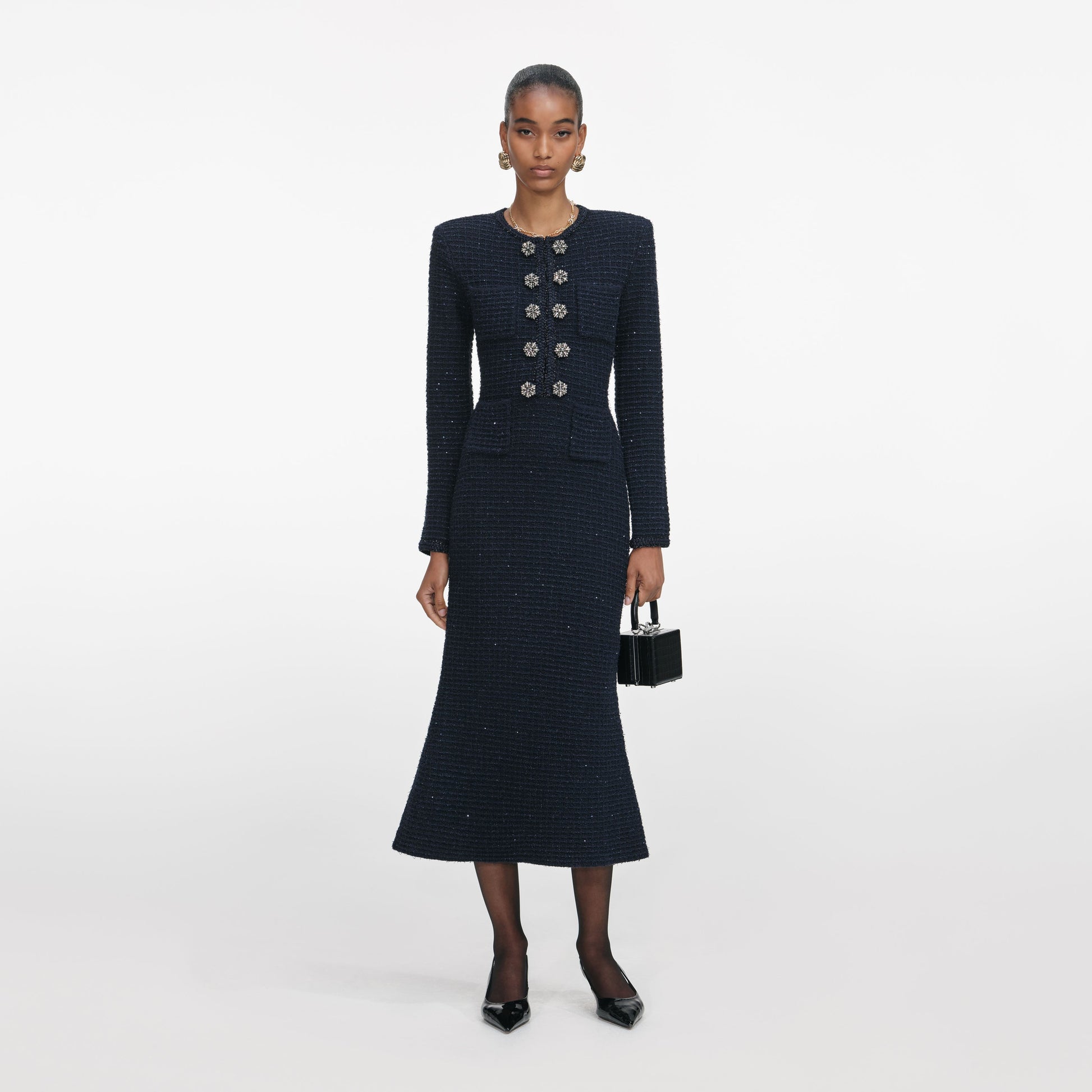 Parıldayan detaylar, güç omuz siluetiyle dikkat çeken bu lacivert dokulu triko midi elbise ile şekillendirilmiş bir uyum sunar. Diamanté düğmelerinin parlaklığını özel küpelerimizle eşleştirin.