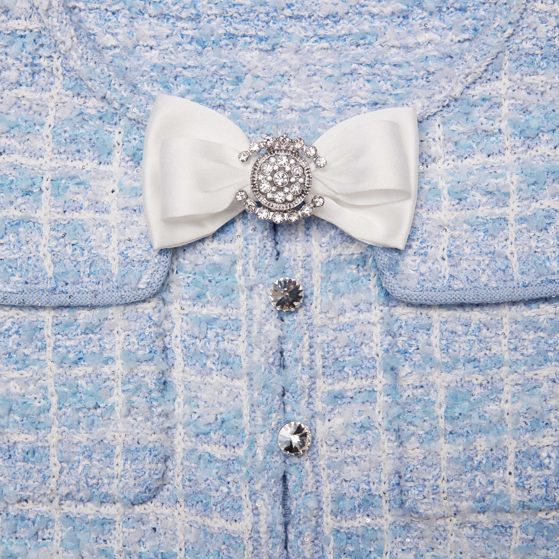 Günümüz klasiklerinden yüksek parlaklıkta bir dokunuş; bu bebek mavisi triko ve taşlı fiyonklar, gece gündüz iltifatlar almanızı sağlayacak. Ekstra ışıltı için parlaklıkla uyumlu gösterişli küpelerimizi eşleştirin.
