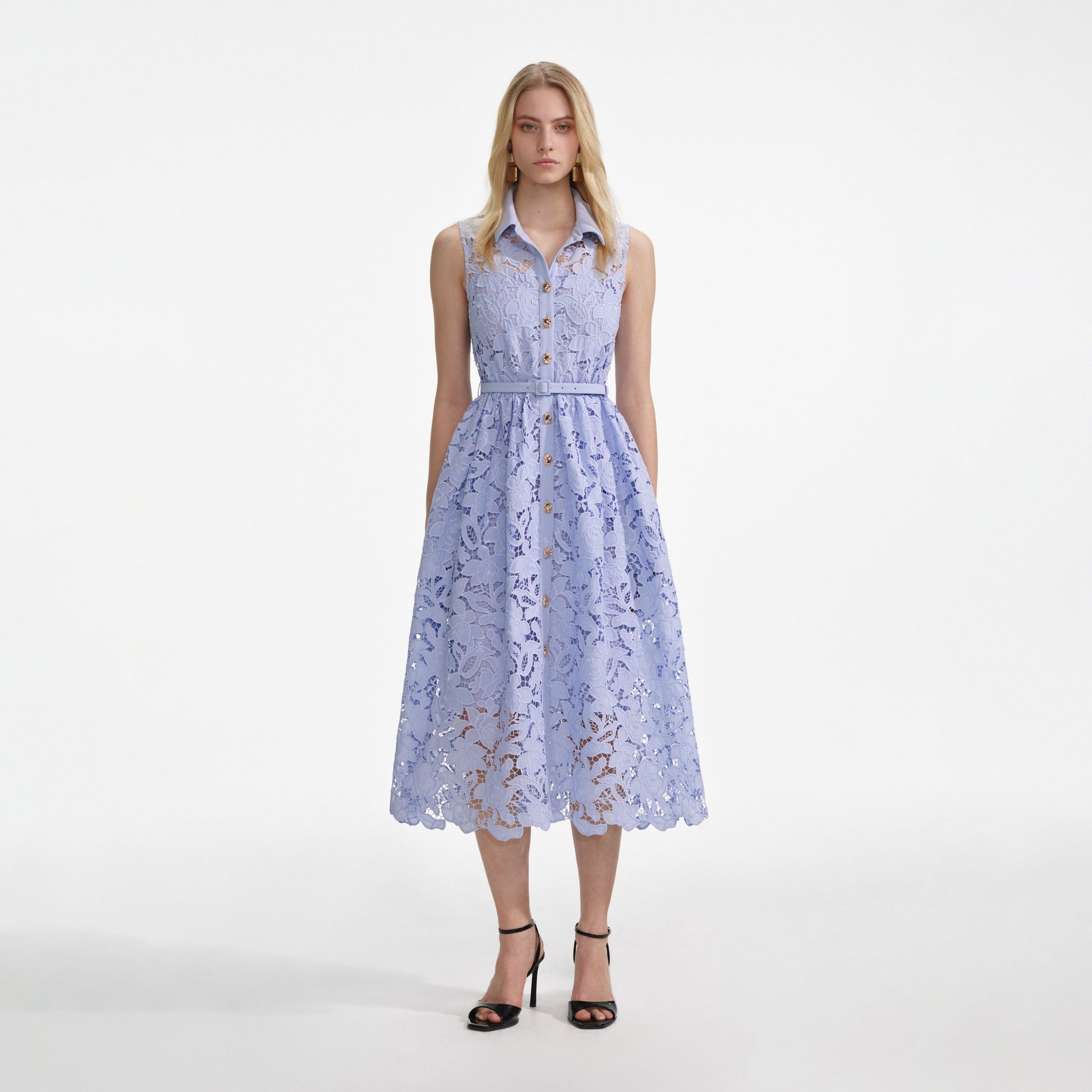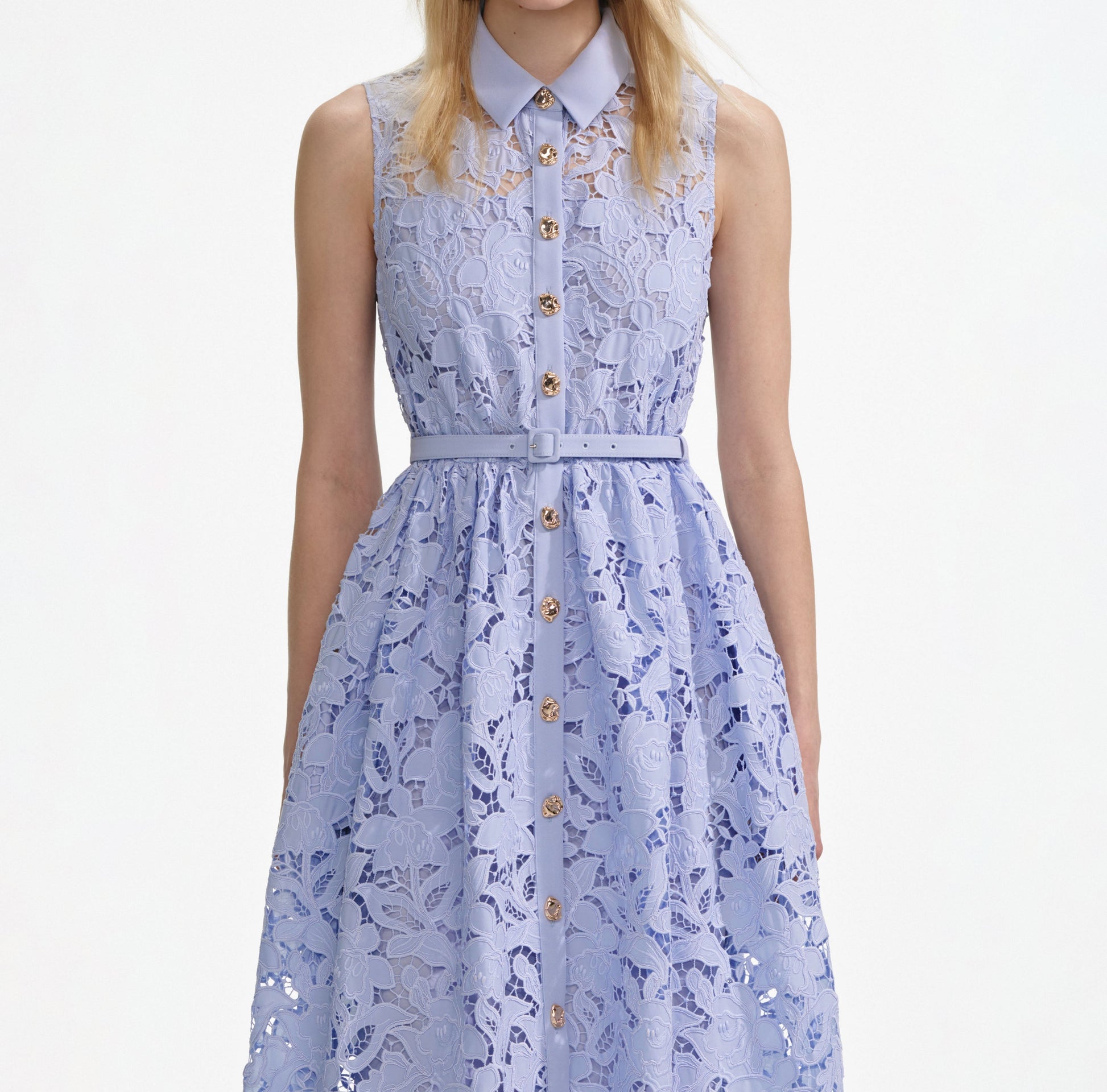 Rahat kesim, bu mavi dantel elbiseye zahmetsiz bir şıklık kazandırıyor. Kemerli bel, dönmeli yaka ve altın düğmeler şık detaylar ekliyor – bir sonraki açık hava buluşmanız için topuklularla tarz yaratın.