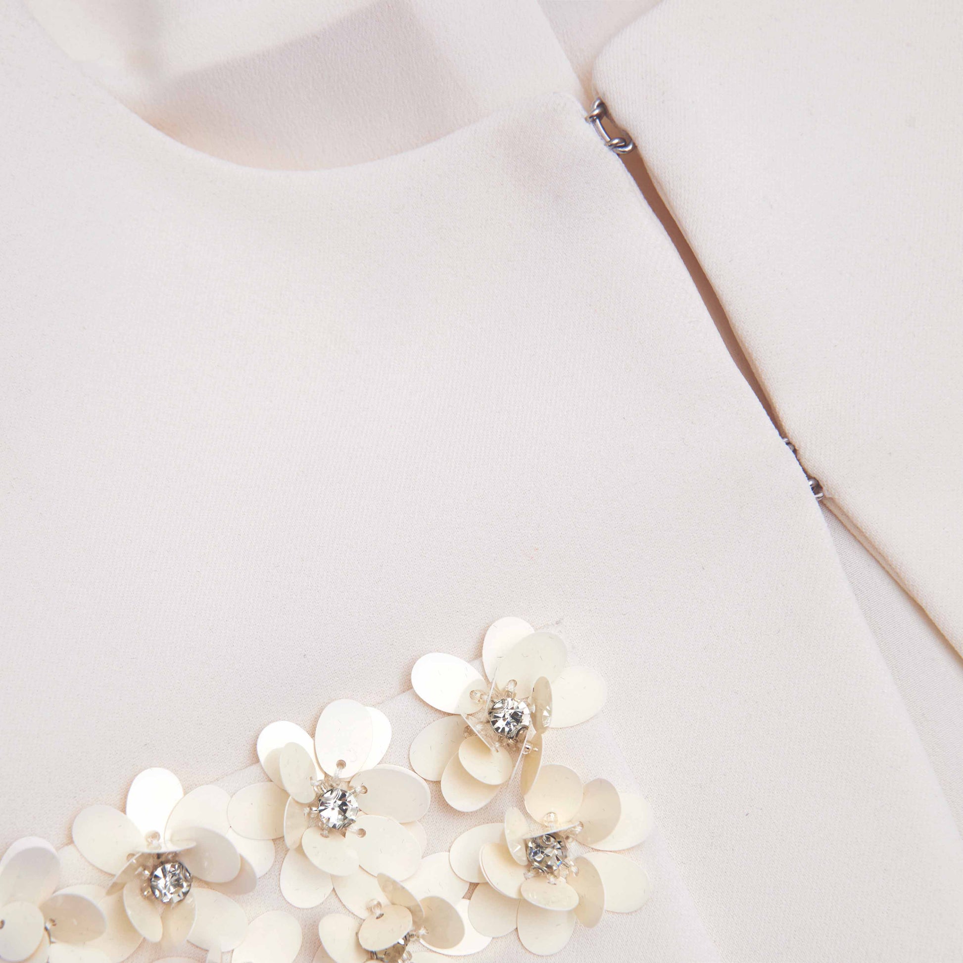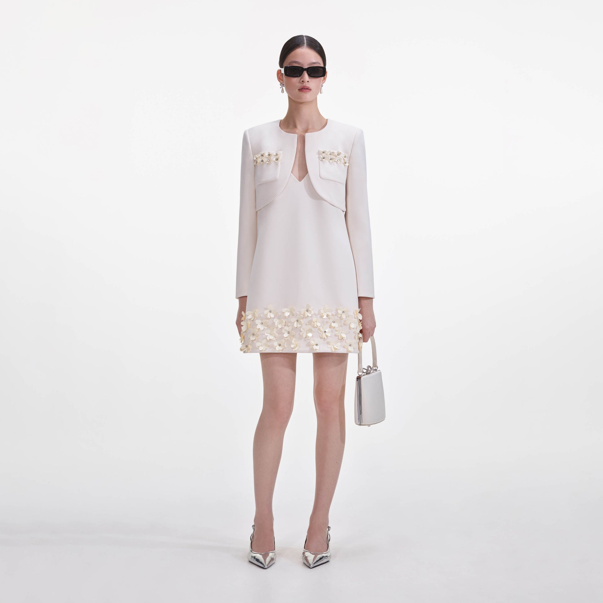 Bu beyaz krepe ceket, yuvarlak kesimi, kısa boyu ve çiçek motifleriyle modern gelin için tasarlanmıştır. Üzerine bir elbise giyin veya hoş geldin kokteylleri ve törenler için terzi işi pantolonlarla eşleştirin.