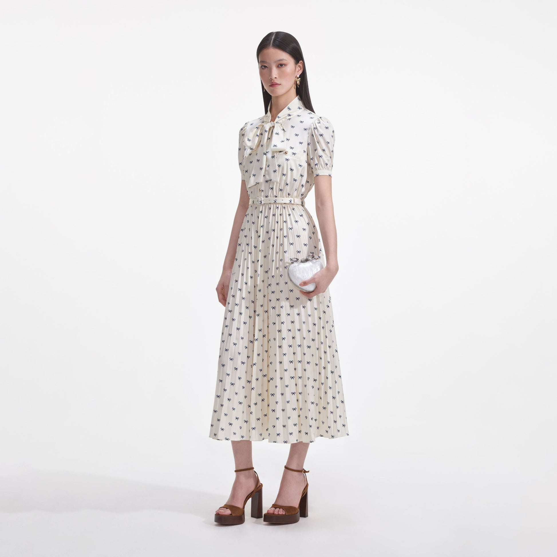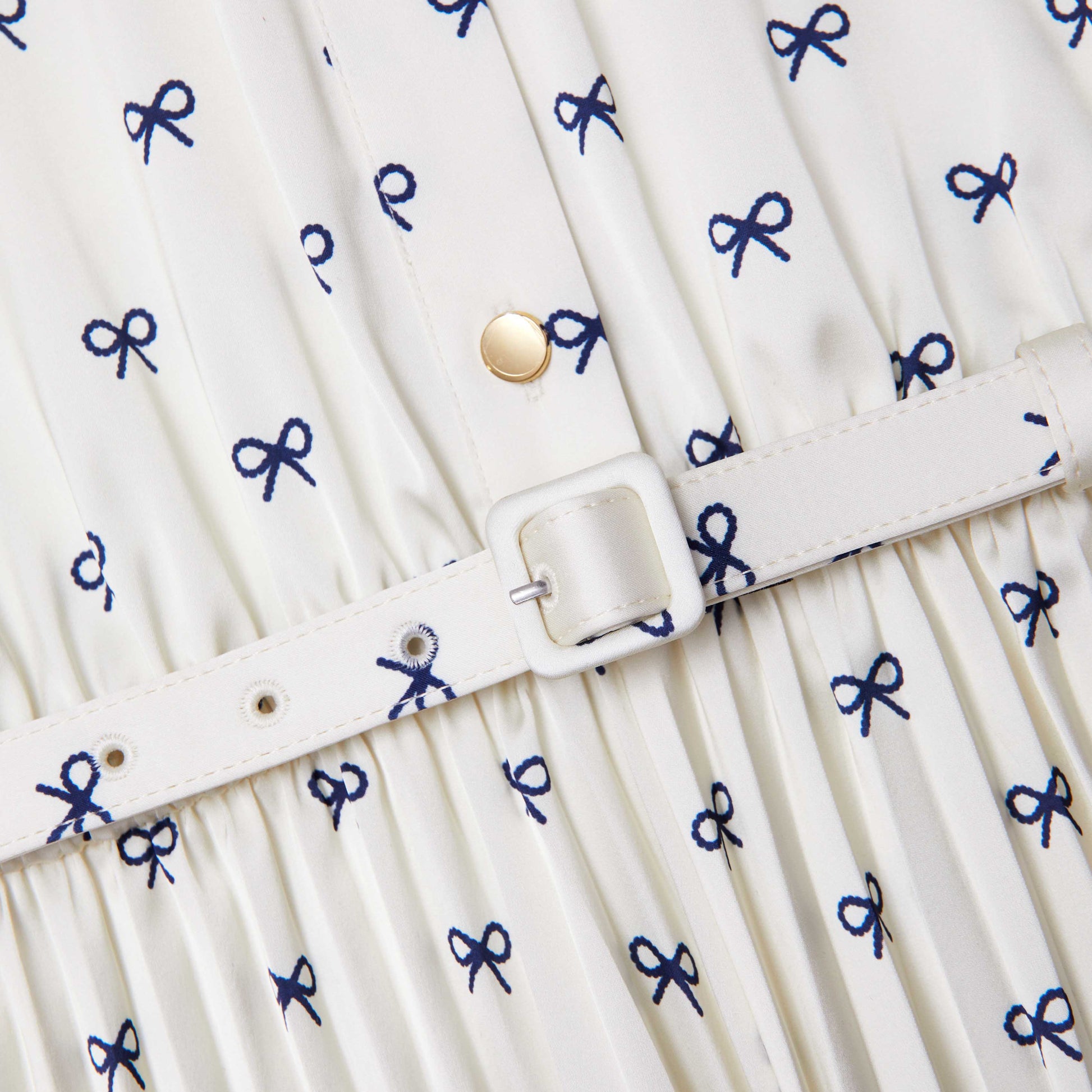 Bu retro-şık saten elbise, fiyonk söz konusu olduğunda daha fazlasının daha iyi olduğunun kanıtı. Bir fiyonk yakası, eğlenceli desenin vurgusunu ikiye katlıyor – altın düğmelerini bir çift iddialı küpemizle eşleştirin.