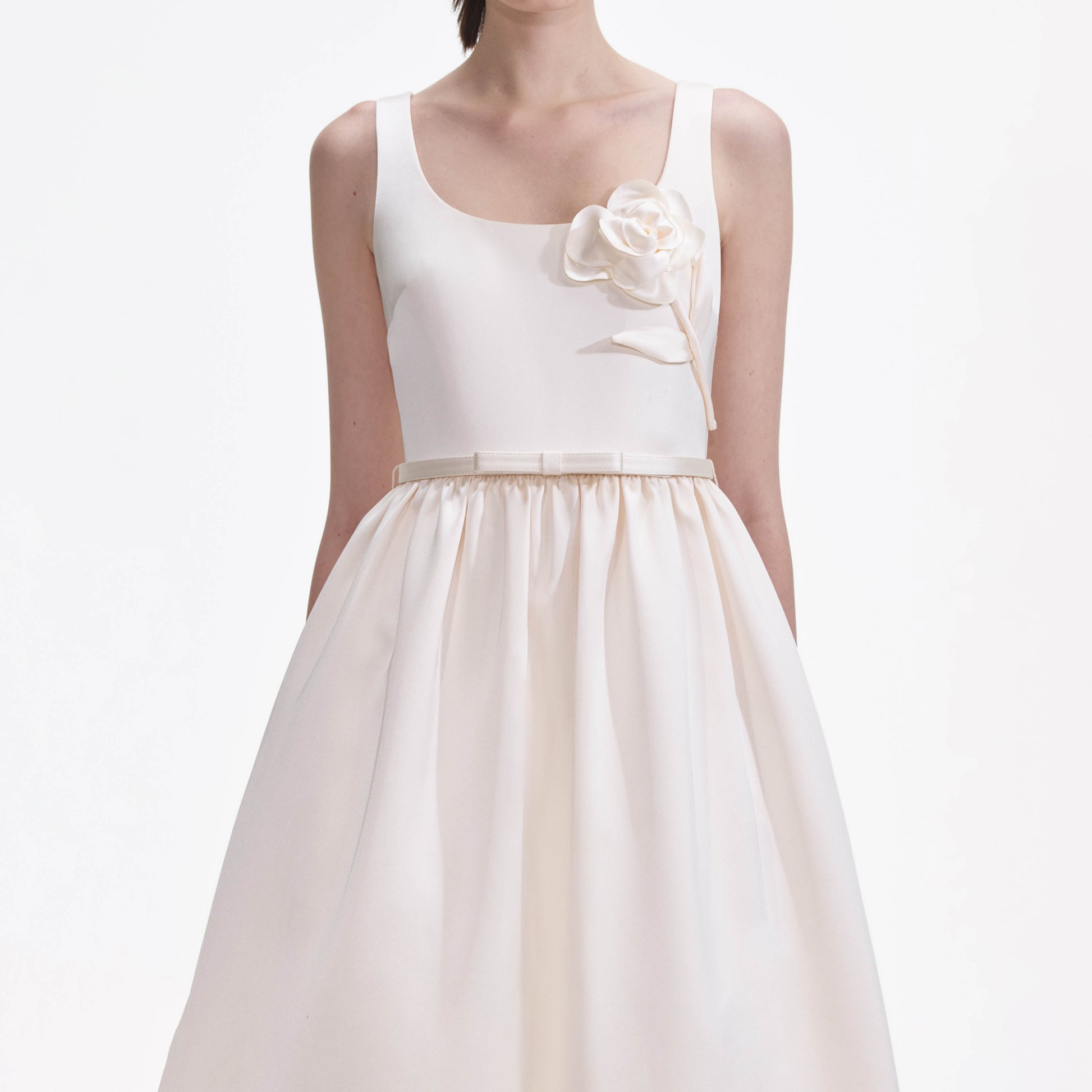 Açık ve pırıl pırıl silüet ile tam hacimli eteği, bu saten elbiseye eski okul şıklığı kazandırıyor. Aksesuarlar dahil olup, çiçek motifleri ve fiyonk detaylı kemer ile gelir – tam etki için topuklu ayakkabı ekleyin.