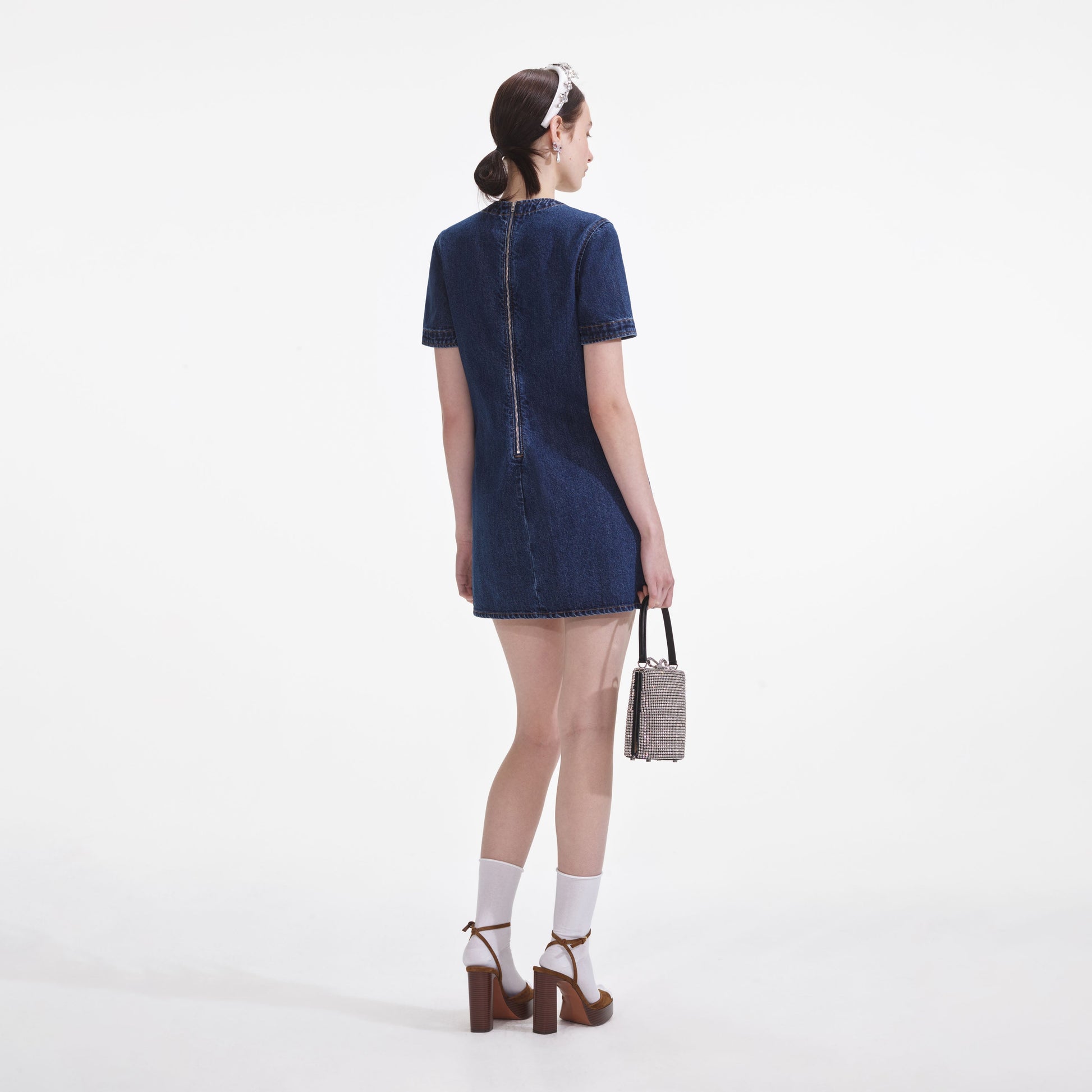 Sokak modasına feminen bir dokunuş katan bu denim elbise, inci ve taş detaylı fiyonklarla süslenmiş tişört siluetine sahiptir. Bir müzik festivalinde spor ayakkabılarla ya da sıcak bir buluşmada topuklularla kombinleyin.