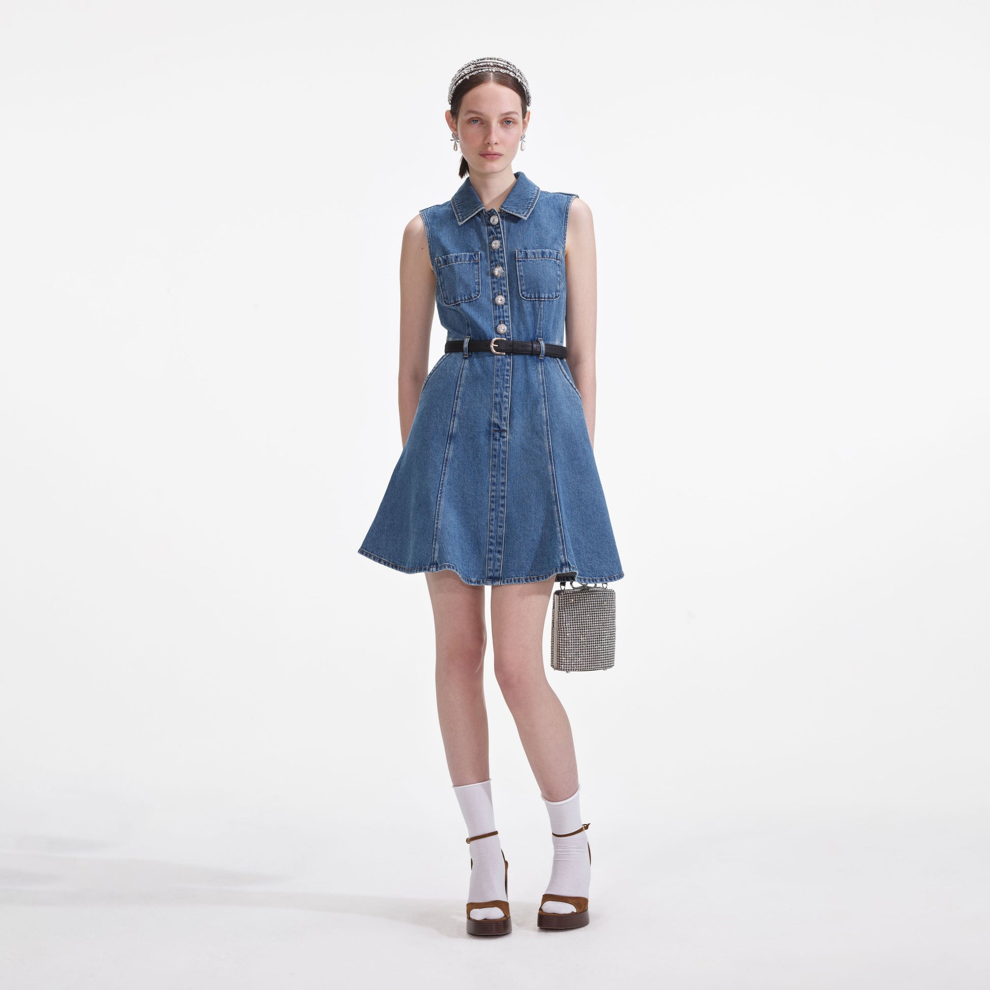 Denim, bu hafif elbisede şık bir hava kazanıyor; güzel duran revere yakası ve kemerli beliyle. Diamanté süslemeler ve düğmeler ekstra ışıltı katıyor – genişleyen mini eteğini hem botlarla hem topuklularla kombinleyin.