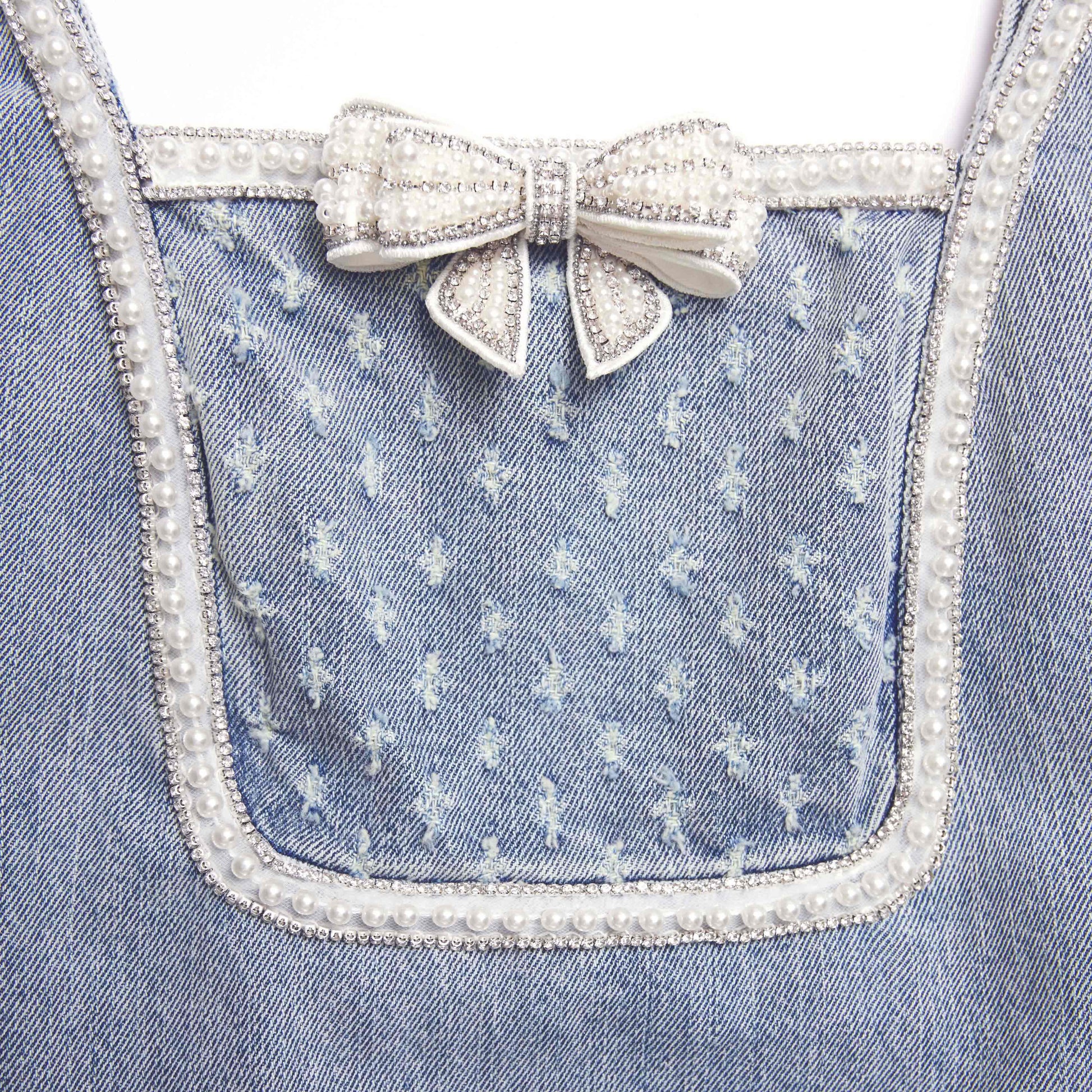 Gerçek mavi denim, bu elbiseye tam anlamıyla Amerikan havası katıyor. Parıldayan fiyonklar ve taşlı süslemeler ön kısmı süslüyor – parlaklığını bizim iddialı küpelerimizle tamamlayın ve gece dışarıda platform topuklarla stilinizi tamamlayın.