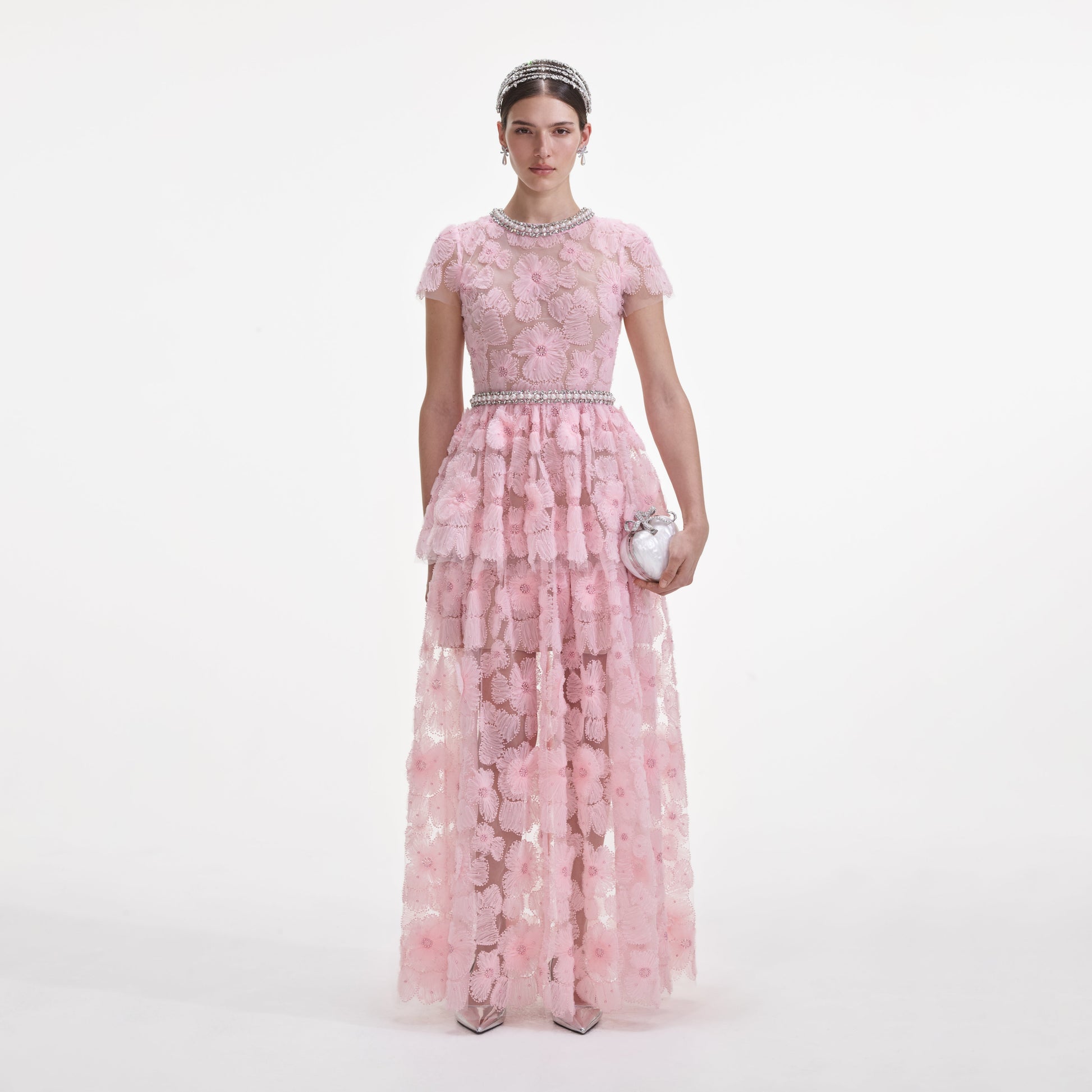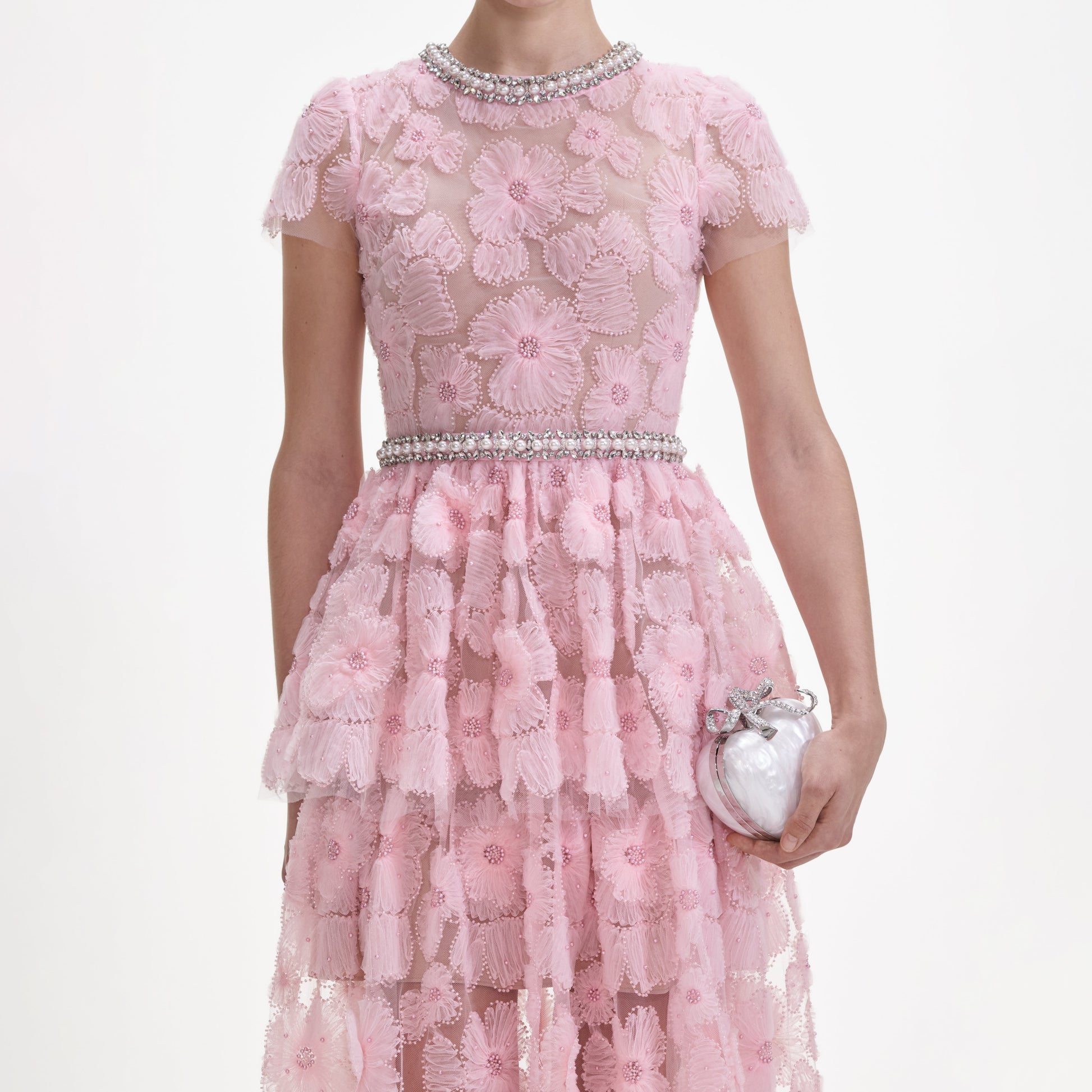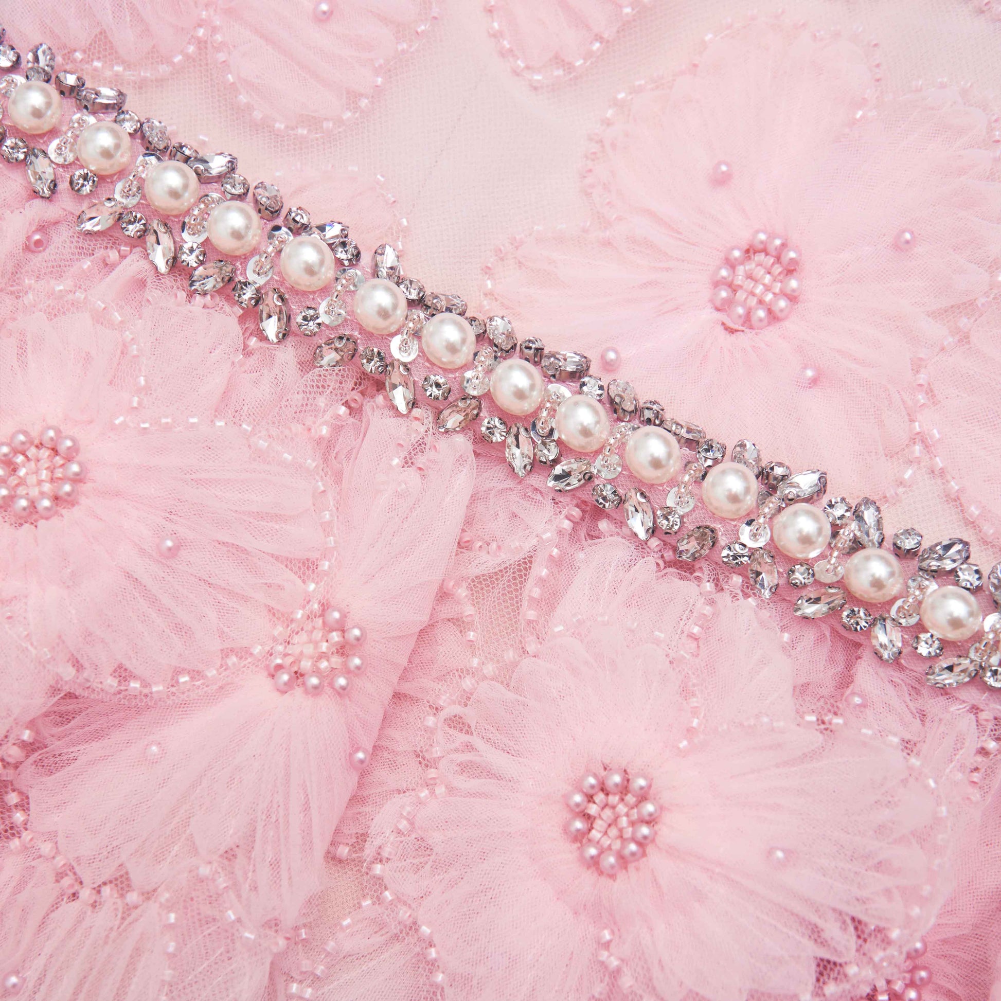 Bir romantizm vizyonu olan bu pembe tül elbise, çiçek motifli detaylarla açıyor. İnci süslemelerle bitirilmiş, parlak aksanlarını özel küpelerimizle eşleştirin.