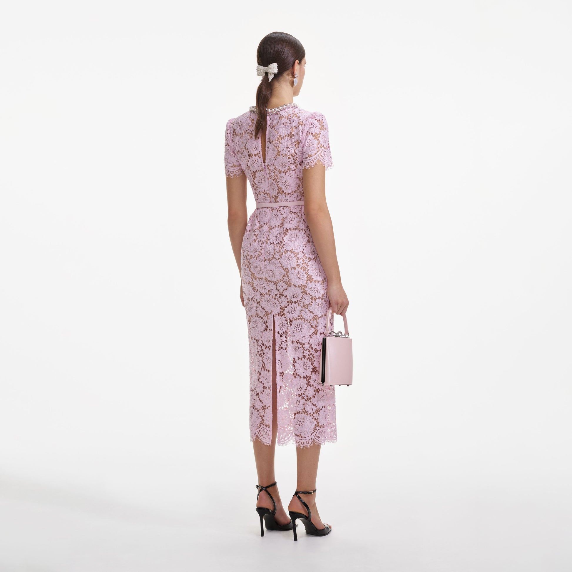 Pembe açan bu midi elbise, romantik bir etki için imza dantelimizden üretilmiştir. İnci süslemelerini, belirgin küpelerimizle eşleştirin ve bir düğün partisi için topuklu ayakkabılarla giyin.