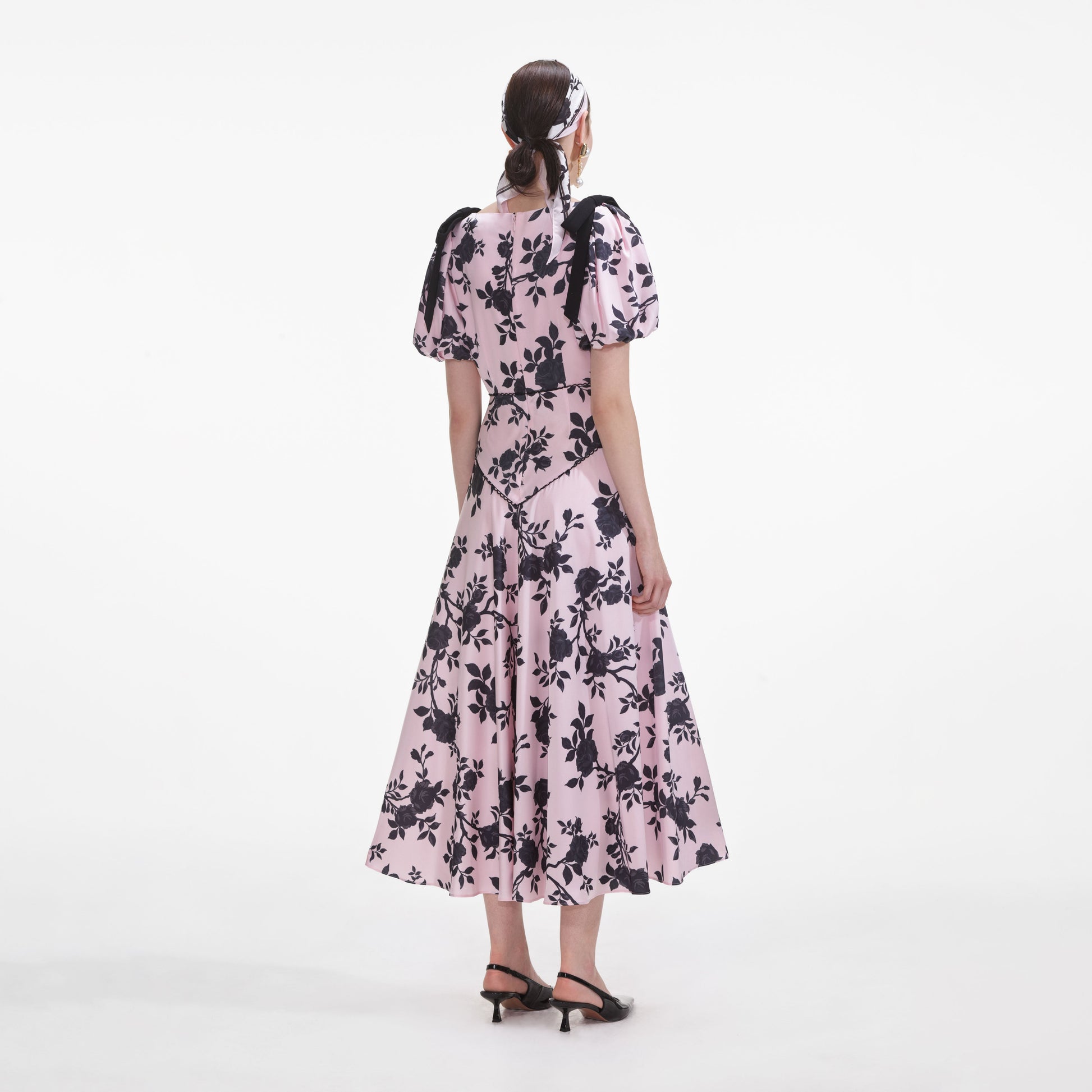 Pembe çiçekli saten kumaştan kesilen bu midi elbise, dramatik balon kollari, genişleyen eteği ve bağlamalı fiyonk detaylarıyla şık bir siluet yaratıyor. Görünümü tamamlamak için ücretsiz Çiçek Desenli Twill Fularımızı kullanabilirsiniz.