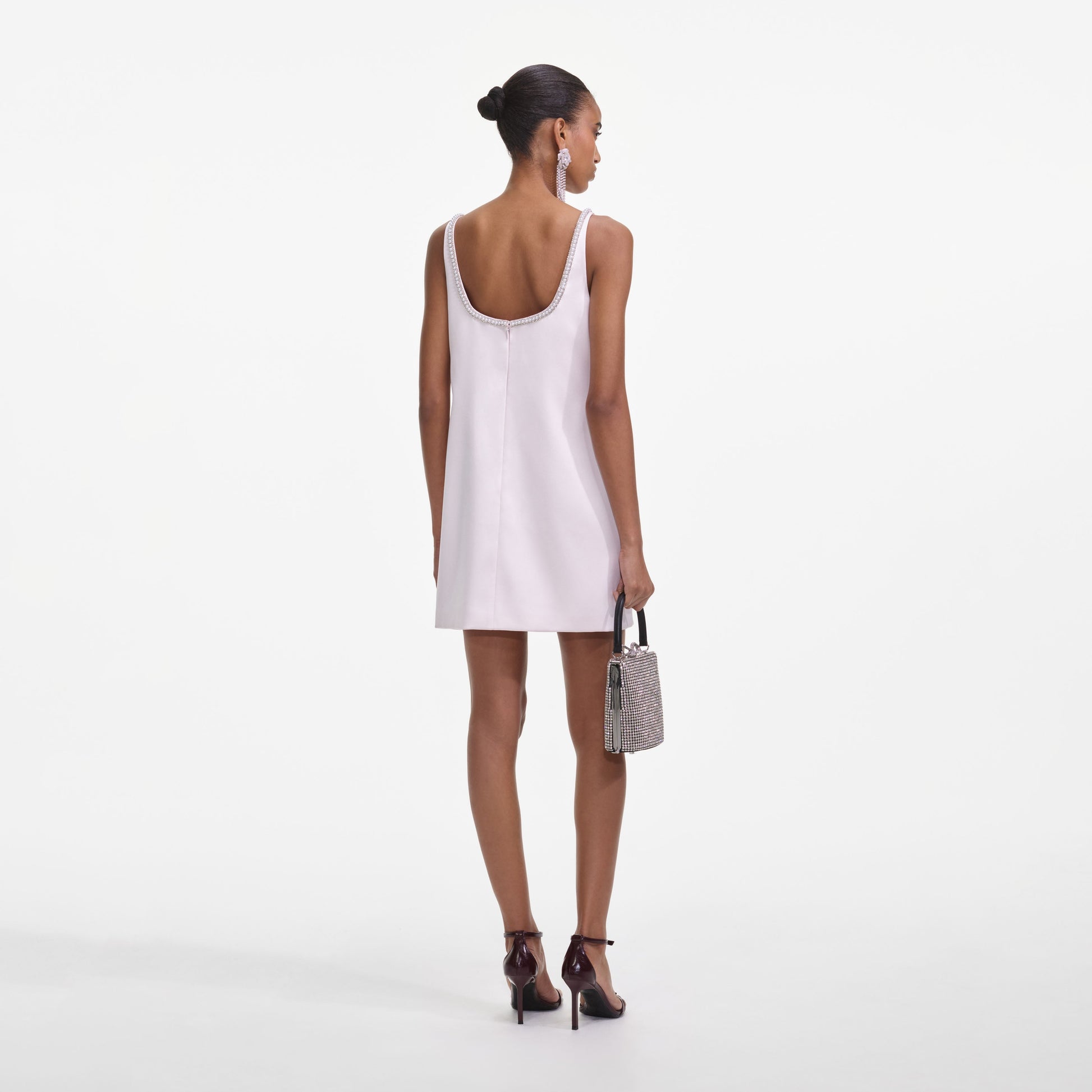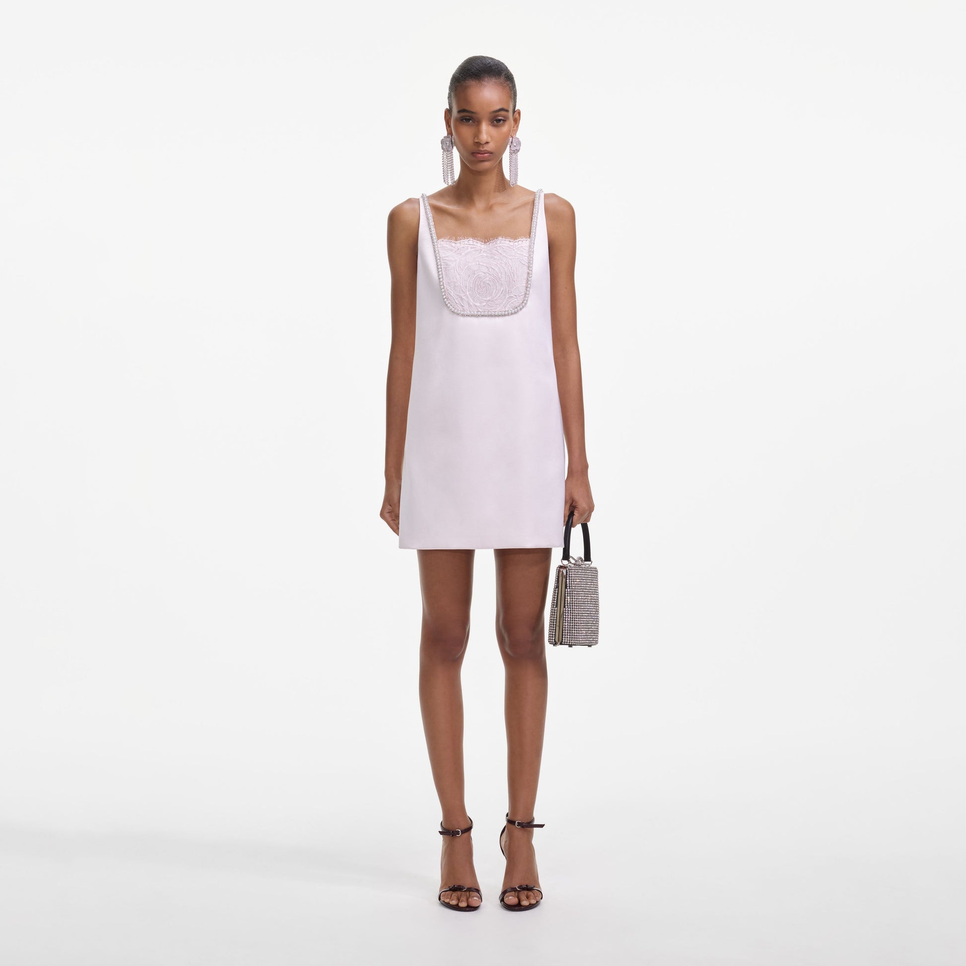 Retro Mod silueti, bu saten mini etekte şirin bebek pembesiyle buluşuyor. Diamanté süslemeler ve dantel detaylar parlak dokunuşlar katıyor – boy uzatan eteğini gökyüzü yüksekliğinde platformlarla gösterin.