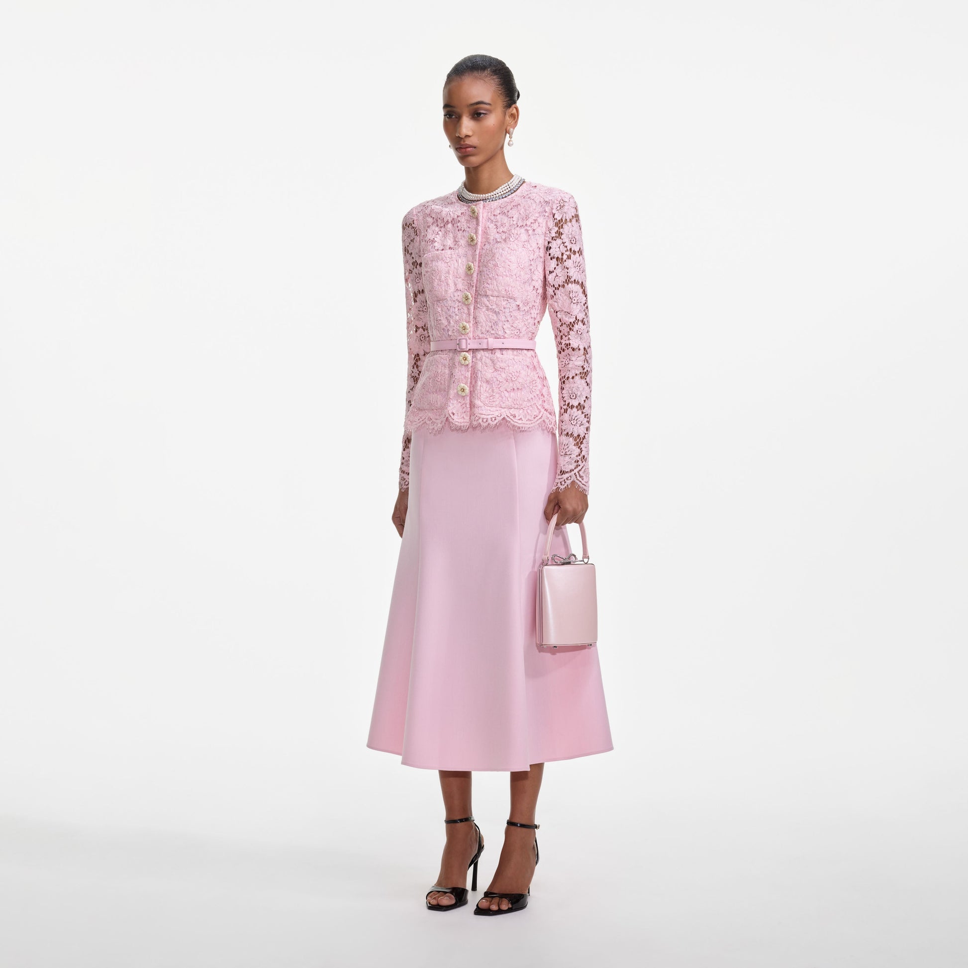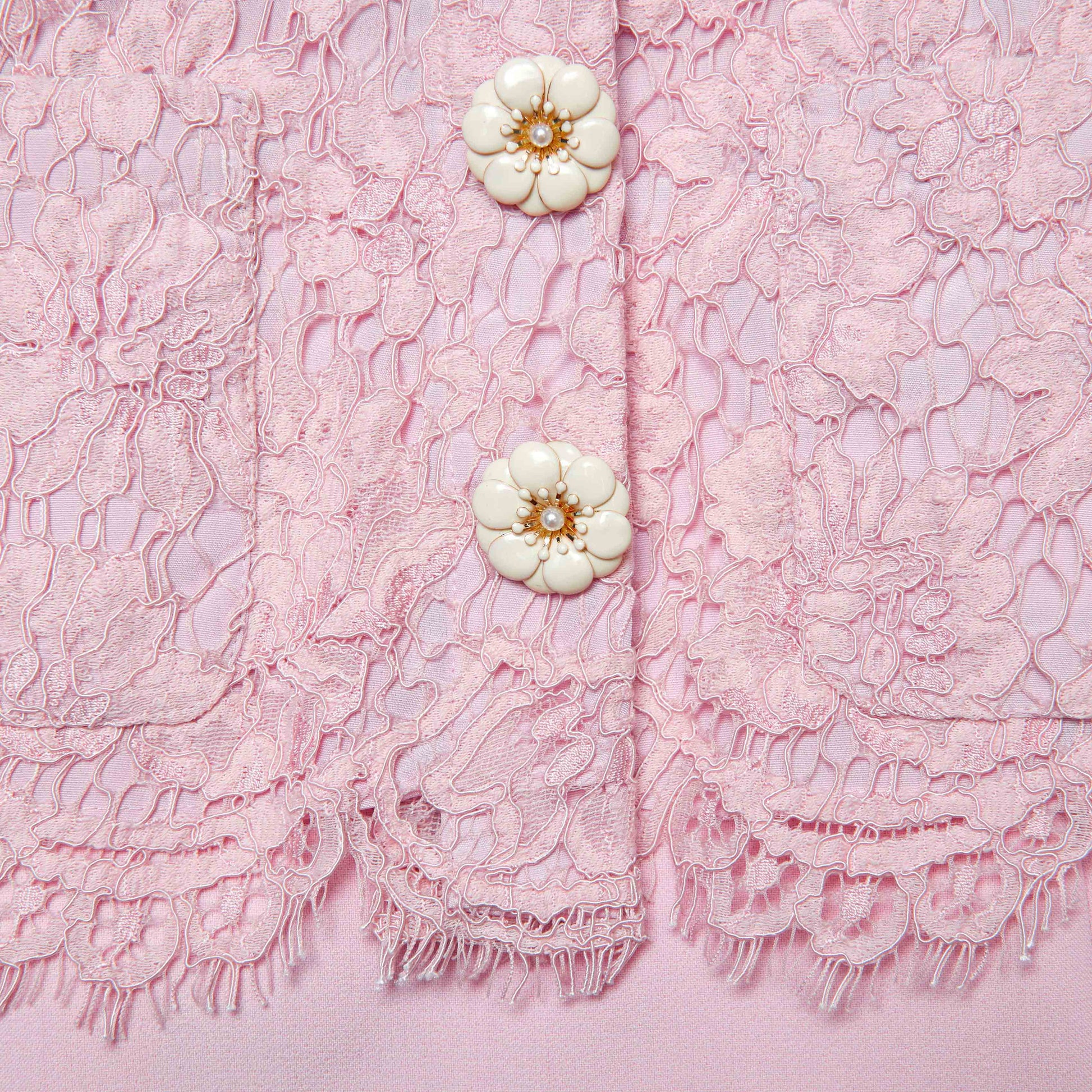 Usta terzilik, feminen detaylarla buluşuyor bu tek parça midi elbisesinde. Belden kemerli, pembe dantel blazer hafif bir etekle tamamlanıyor. Diamanté düğmeler ise üzerine tatlı bir dokunuş.