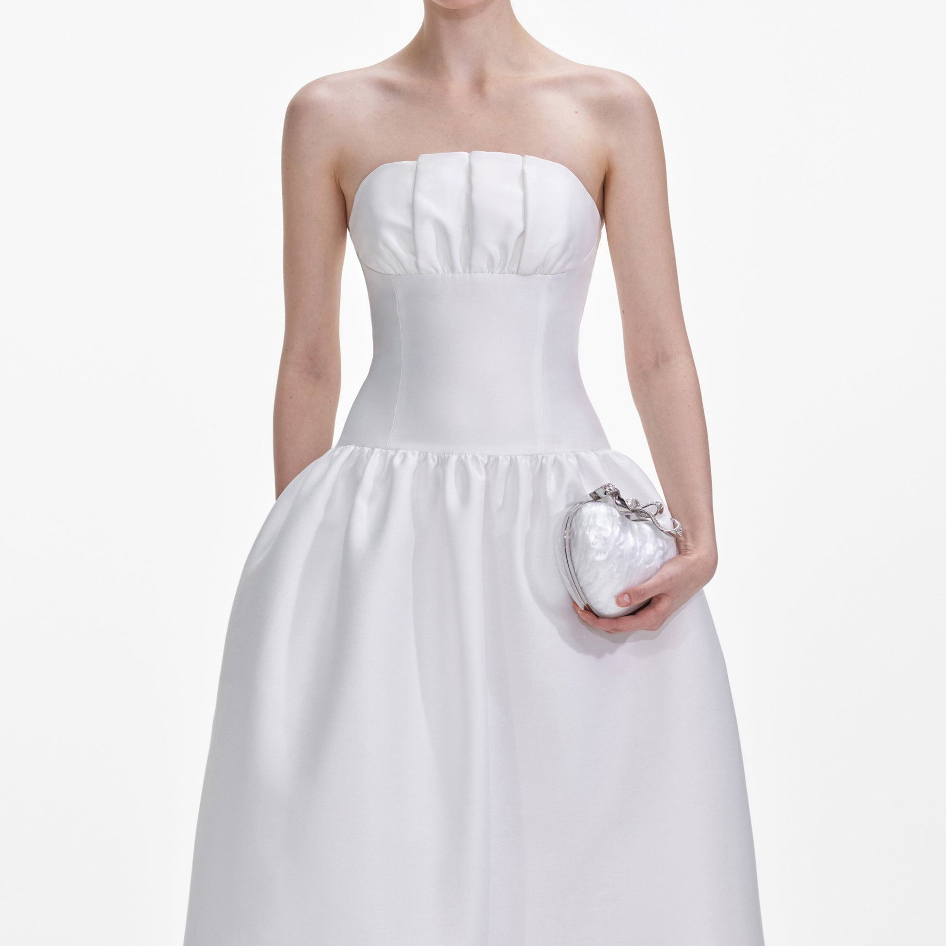 Bu tafta elbise, korse detaylı kavisli bir yaka ile çerçevelenmiş etkileyici bir ifade oluşturuyor. Tam dökümlü düşük belli etek, olağanüstü bir ihtişam yayıyor – büyük gün için gösterişli bir kolye ile tamamlayabilirsiniz.