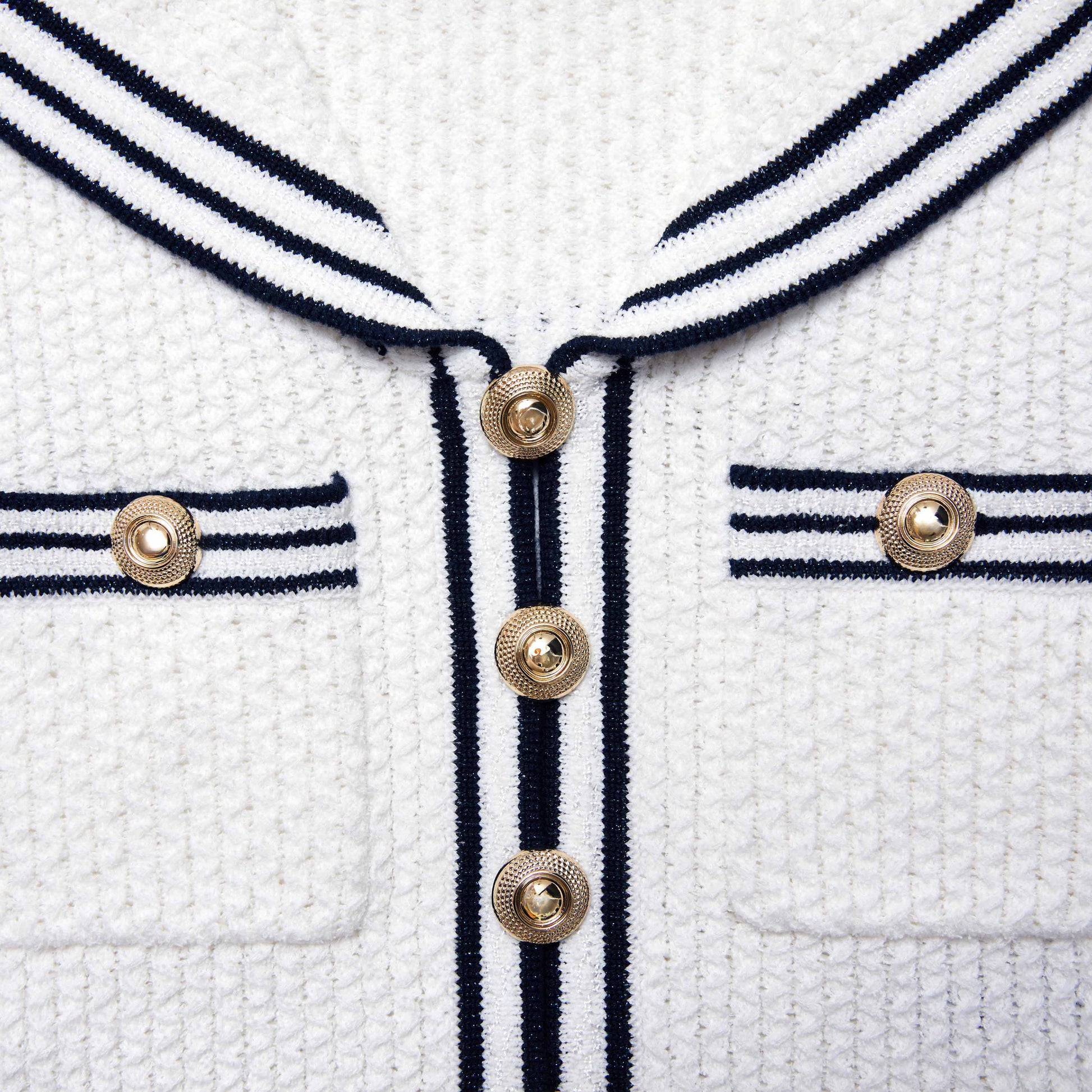 Denizci şıklığını bu dokulu örme üstte yaşayın, denizci esintili yakası, çizgili kenarları ve altın düğmeleriyle. Gündüz için denim ile kombinleyin veya şık bir kız üniforması için uyumlu etekle giyin.