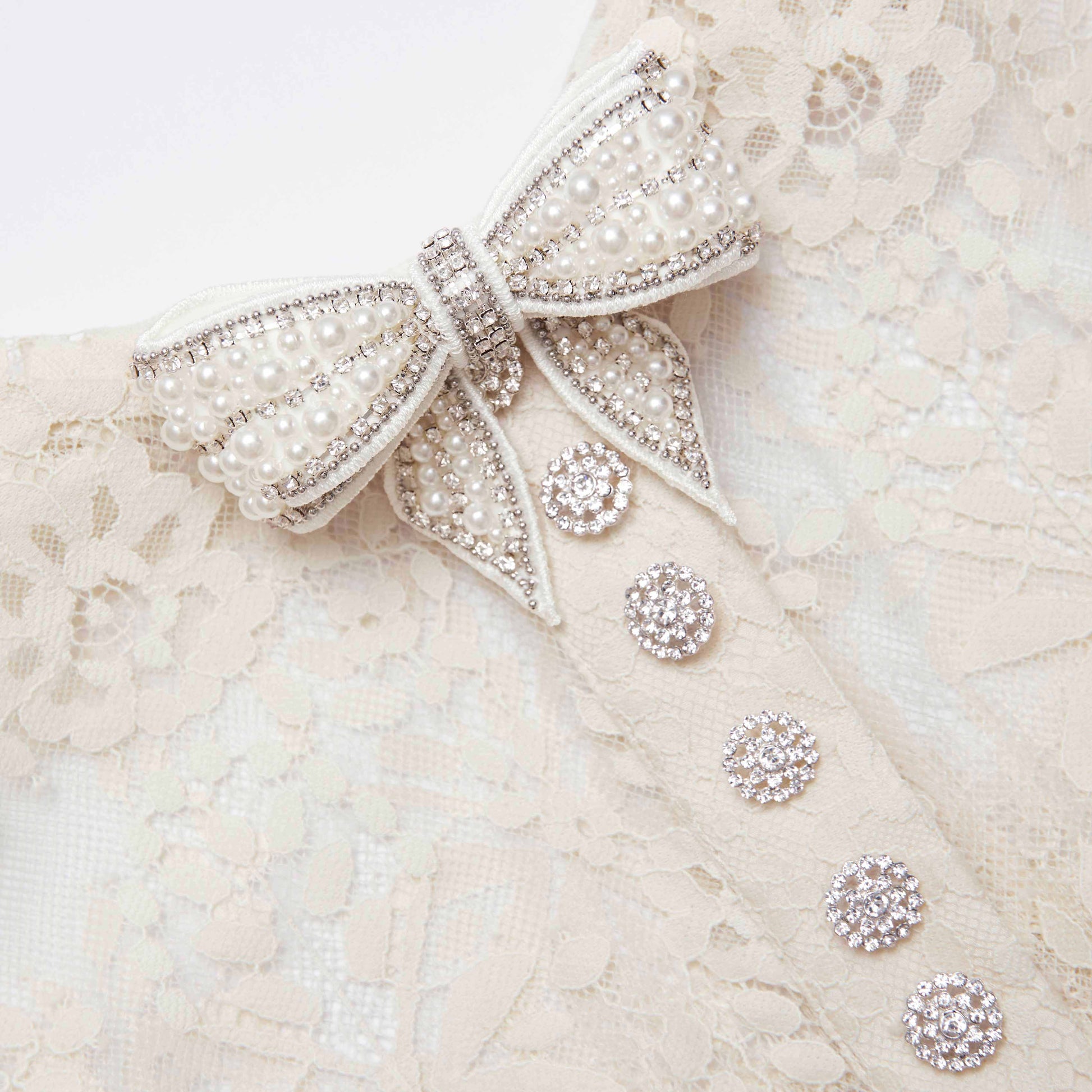 İki katmanlı eteği ve fırfırlı süslemeleriyle bu beyaz dantel elbisede eterik bir romantizmi yakalayın. Diamanté fiyonklar ve düğmeler ise tam anlamıyla şıklığın üstüne şıklık katıyor – onların parlaklığına bizim güçlü küpelerimizle eşlik edin.