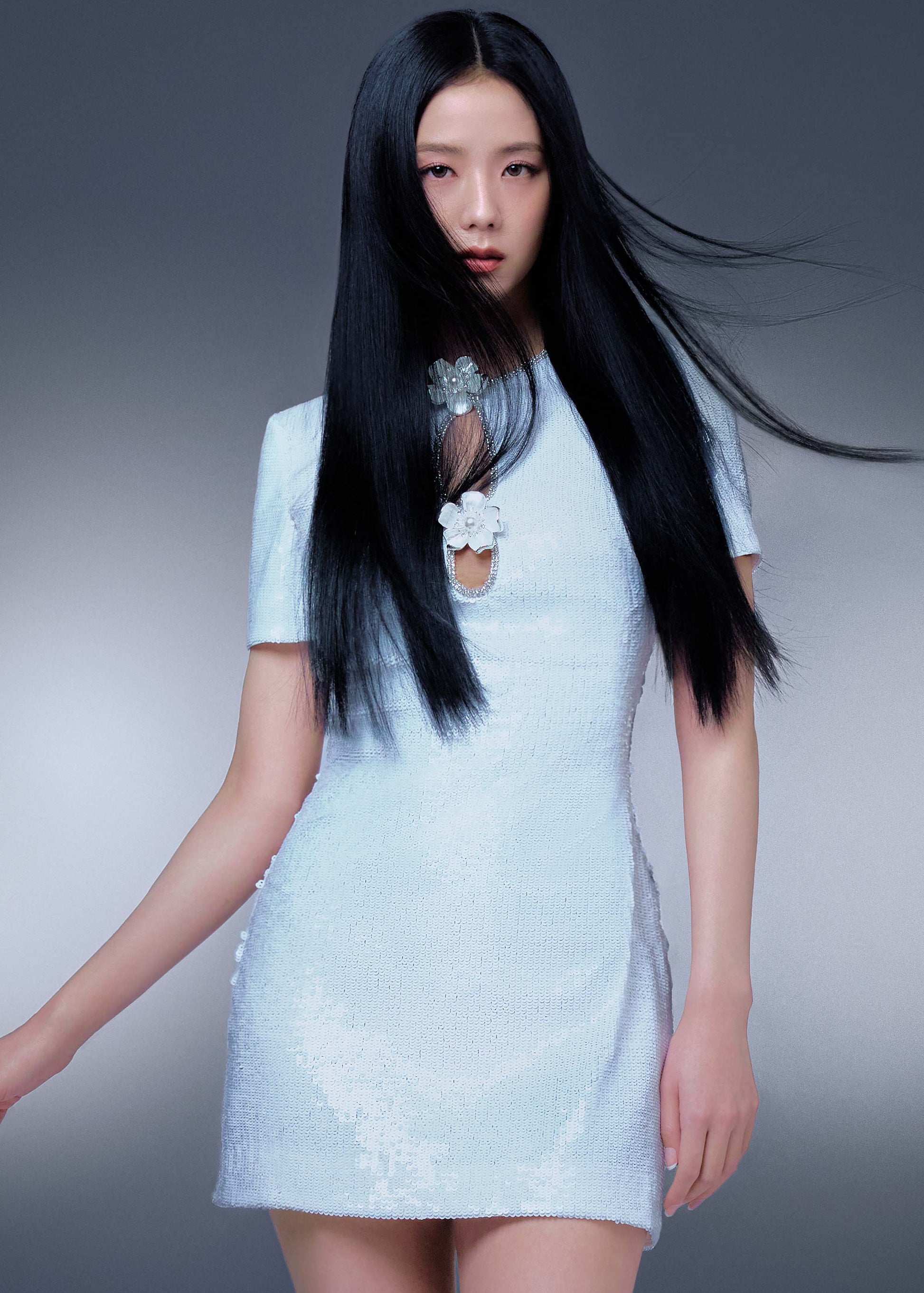 Kalıcı bir siluet, beyaz payetlerle tamamlanmış bu gelinlikte gösterişli detaylarla buluşuyor, tümüyle parlaklık sağlıyor. Mod-şık tasarımının odak noktası: süslemeli anahtar deliği yakası.