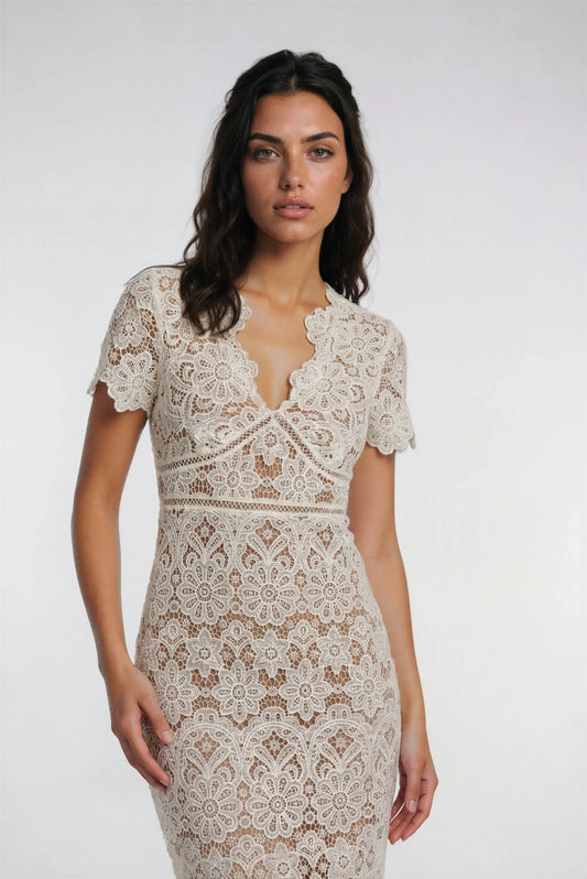 23% İndirimKrem Ortadan Fermuarlı Dantel Elbise