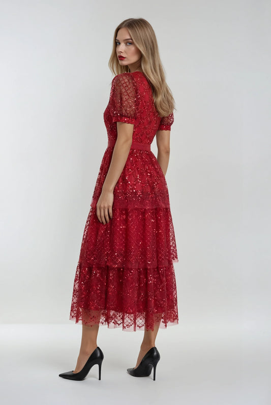30% İndirimİşlemeli Altın Kırmızı Elbise